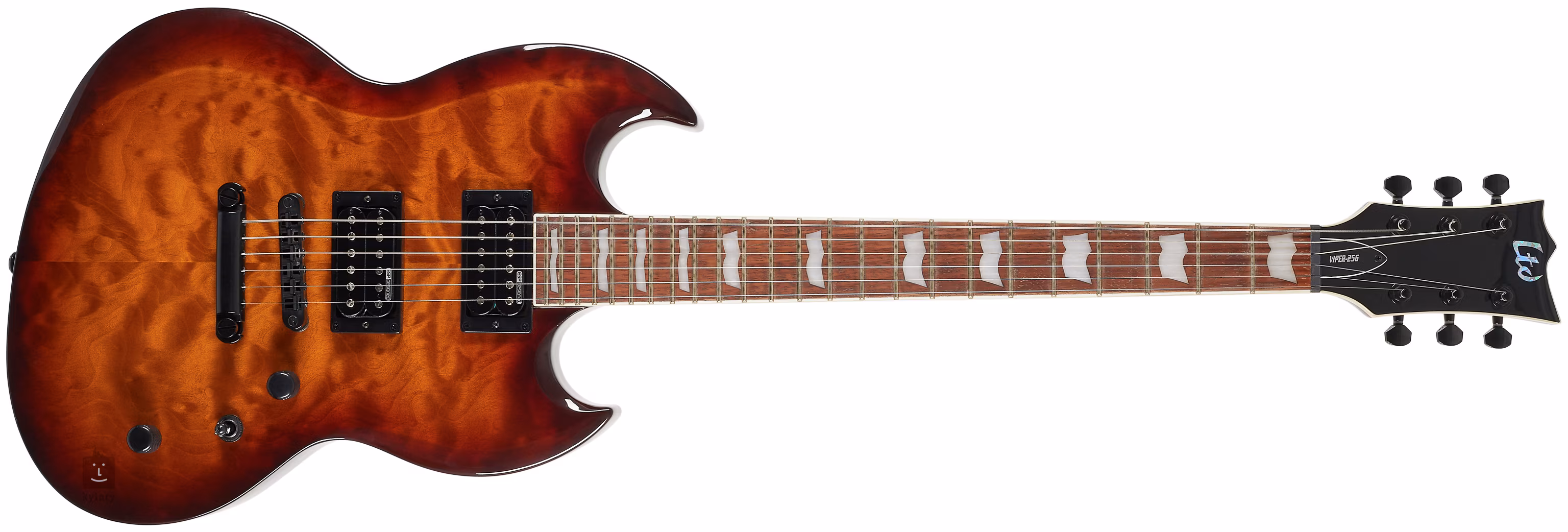 Elektrická gitara v dizajne SG s dvojitým výrezom VIPER-256 DARK BROWN SUNBURST patrí do cenovo dostupnejšej série LTD 200. Je to kvalitne spracovaný nástroj, ktorý poteší nielen začínajúcich gitaristov.
