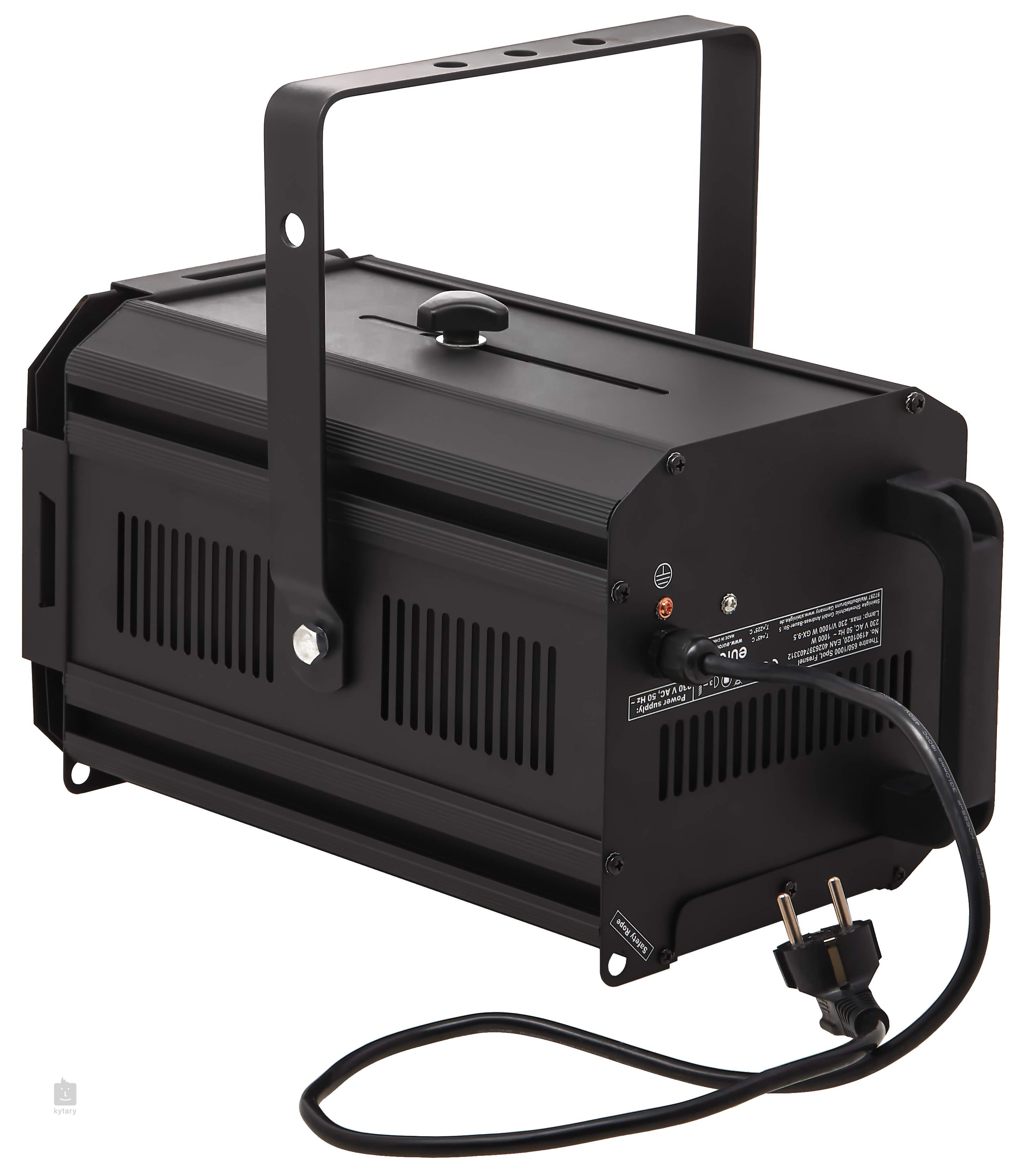 Divadelný reflektor Theatre 650/1000 od spoločnosti Eurolite vo verzii Fresnel je vysokokvalitný javiskový reflektor s Fresnelovou šošovkou, ktorý možno použiť na osvetlenie divadelných predstavení, tanečných vystúpení alebo koncertov. Jeho svetelným zdrojom je žiarovka 650 alebo 1000 W (nie je súčasťou dodávky) s päticou GY 9,5. Reflektor je vybavený manuálnym zoomom a ponúka uhol vyžarovania v rozsahu od 10° do 40°. Súčasťou balenia je rám na farebné filtre a ochranná mriežka.