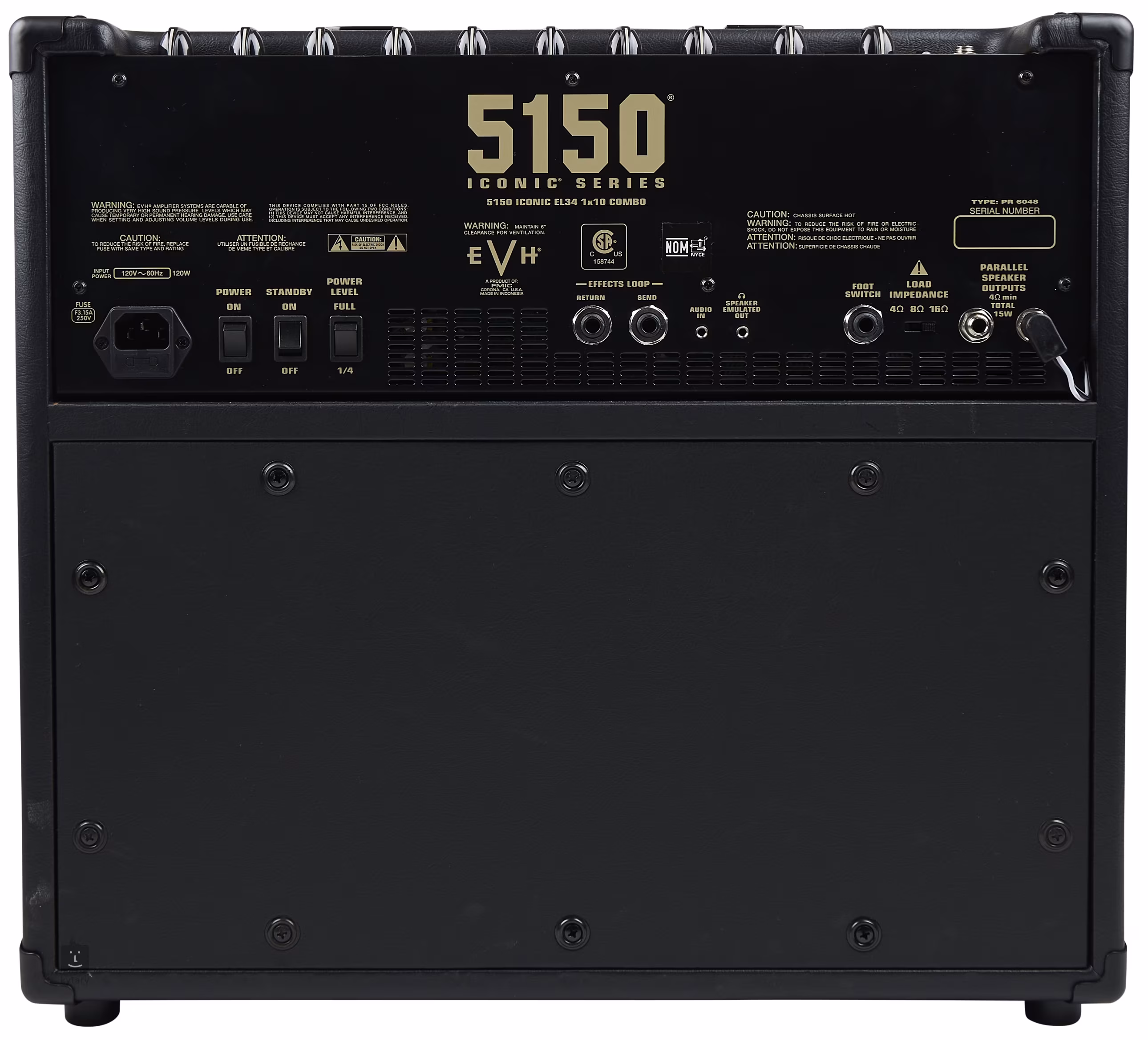 Zadný panel ponúka efektovú slučku (Send, Return), dva reproduktorové výstupy s voliteľnou impedanciou (4, 8, 16 ohmov), Aux in na prehrávanie sprievodných skladieb, 3,5 mm výstup s emuláciou reproduktora na priame nahrávanie alebo zapojenie do PA systému (možno ho použiť aj ako slúchadlový výstup) a jednokanálový konektor pre nožný spínač, ktorý je súčasťou balenia. Nájdete tu aj výkonový atenuátor (Full, 1/4), takže kombo môžete používať pri nižších hlasitostiach bez toho, aby ste prišli o jeho teplý, lampový tón. Kabinet komba je potiahnutý čiernym textúrovaným vinylom a zdobia ho zlaté logá EVH a 5150. Ovládací panel má tiež zlatú povrchovú úpravu z eloxovaného brúseného hliníka. Skrátka, ide o kombo, ktoré je zvukom a dizajnom verné odkazu Eddieho Van Halena.