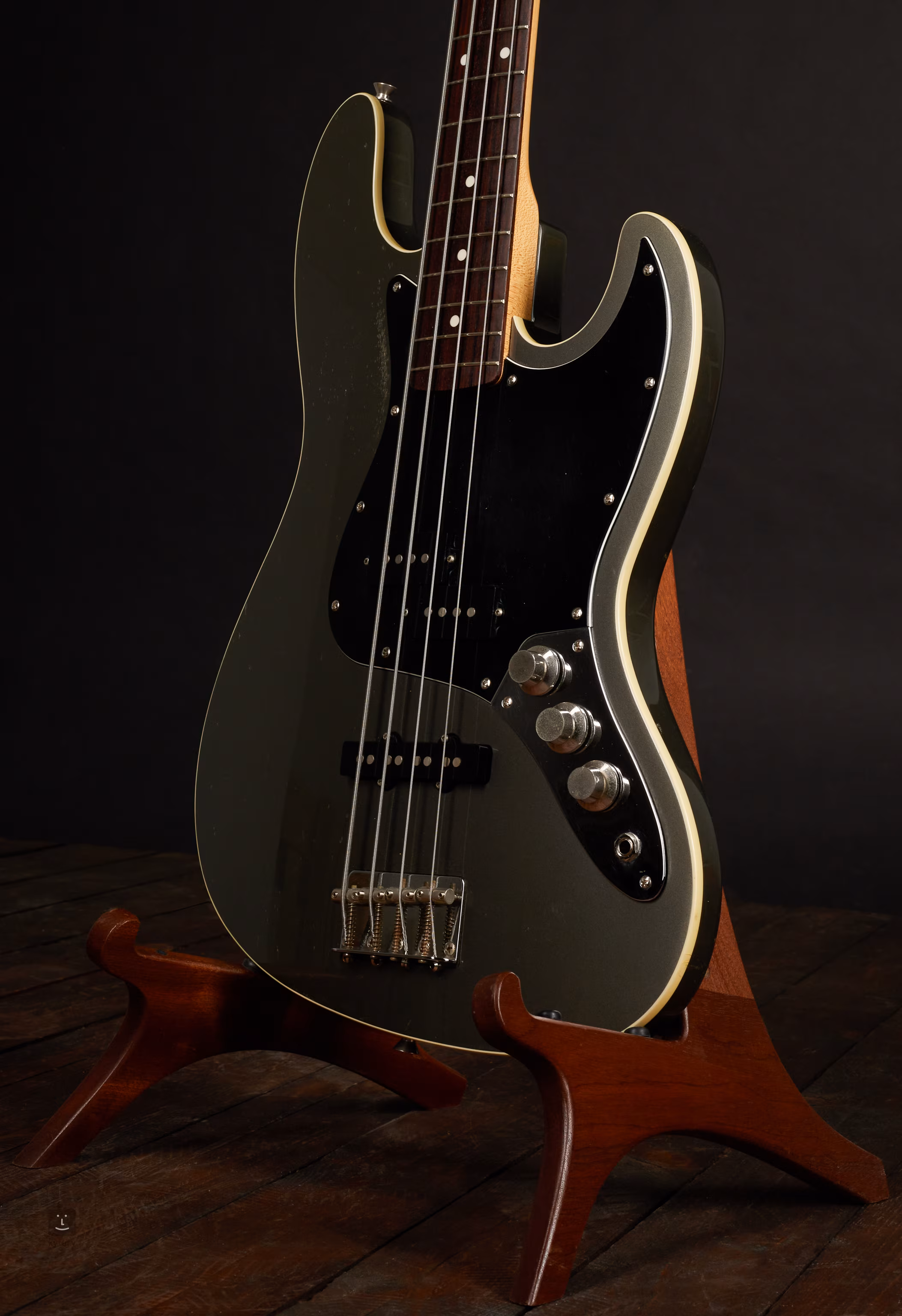 Japonská basgitara Fender Aerodyne s konfiguráciou snímačov P/J s metalicky šedým telom vrátane zodpovedajúcej hlavy.