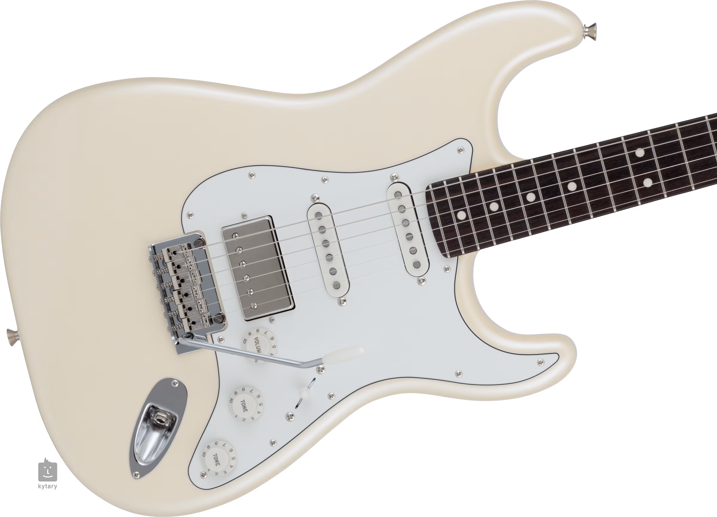 Telo 2024 Collection Made in Japan Hybrid II Stratocaster HSS Olympic Pearl je vyrobené z jelše. K javorovému krku s pohodlným profilom "Modern C" je prilepený palisandrový hmatník osadený dvadsiatimi dvoma pražcami Narrow Tall. Biele polohové bodky na hmatníku uľahčujú orientáciu.