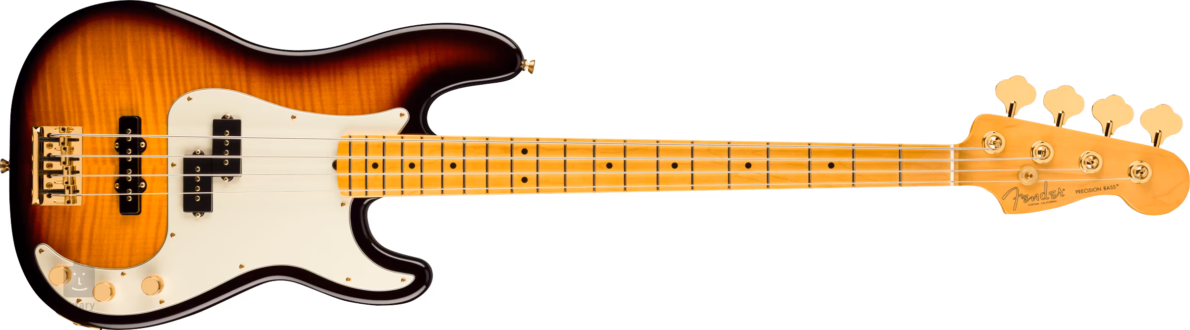 Telo basgitary z jelše je zdobené nápadným vrchným dielom z plamenného javora. Vzor plamenného javora je zdôraznený štýlovým lesklým 2-farebným povrchom Sunburst. Javorový krk s vintage profilom '63 P Bass, zaoblenými hranami a rádiusom hmatníka 9,5 palca, pražcami Medium Jumbo a kontúrovanou pätkou krku ponúka vynikajúcu hrateľnosť, ktorú ocenia basgitaristi všetkých hudobných štýlov.