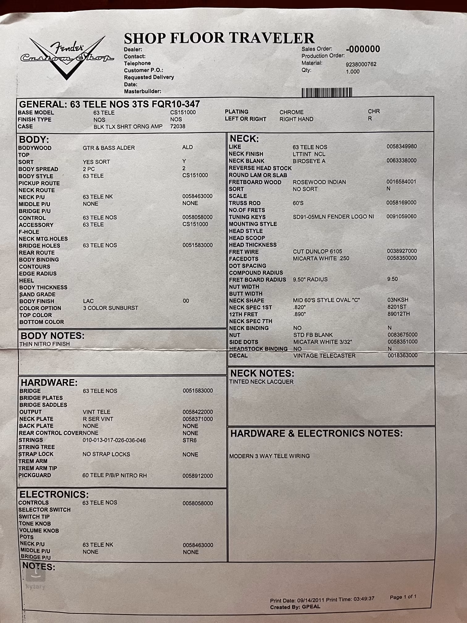 Elektronika je úplne pôvodná. Na hrane tela pri pickguarde je väčší ťukanec, tónovaný do čierna. V hlave boli nainštalované kvalitné kompenzačné kamene pre lepšie ladenie, originálne kamene sú súčasťou balenia. Súčasťou originálneho kufra je aj certifikát Fender Custom Shop, kryt kobylky, trsátka alebo obchodný cestujúci.