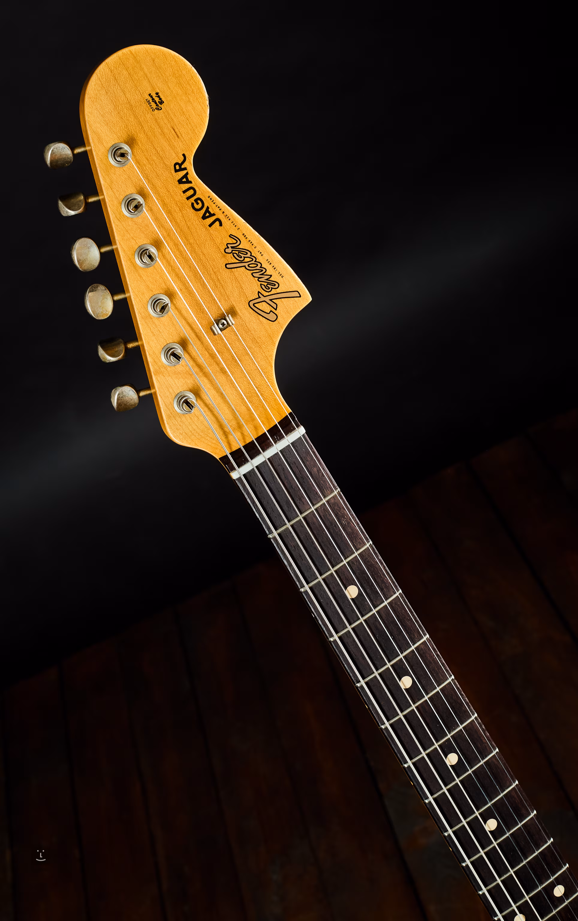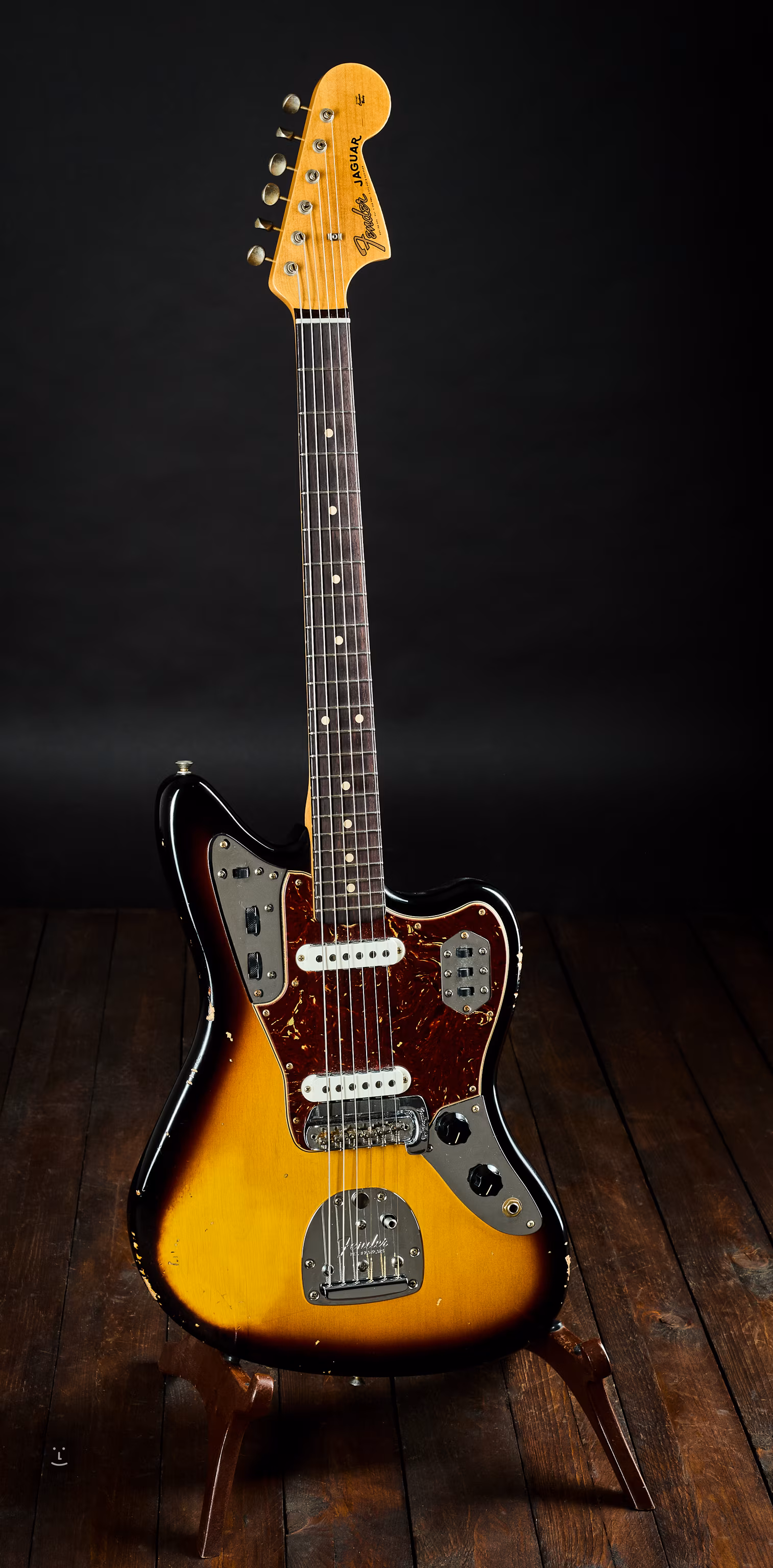 Fender Custom Shop 1962 Jaguar Relic 2TSB zo série Time Machine – autentická replika originálov zo 60. rokov, vyrobená dobovými postupmi a s finišom verne zodpovedajúcim veku a opotrebovaniu. Telo z jelše, Relic patina s drobnými odreninami a škrabancami. Javorový krk s palisandrovým hmatníkom AAA, 22 pražcov Vintage Upgrade (45085), micarta pozičné bodky. Dva vintage-style Jaguar snímače, ľahko nakopnú lampový zosilňovač do vrelého overdrivu. Prepínateľné Rhythm/Lead zapojenie, klasické ovládače a slider prepínače. Vintage mechaniky a Jaguar tremolo.