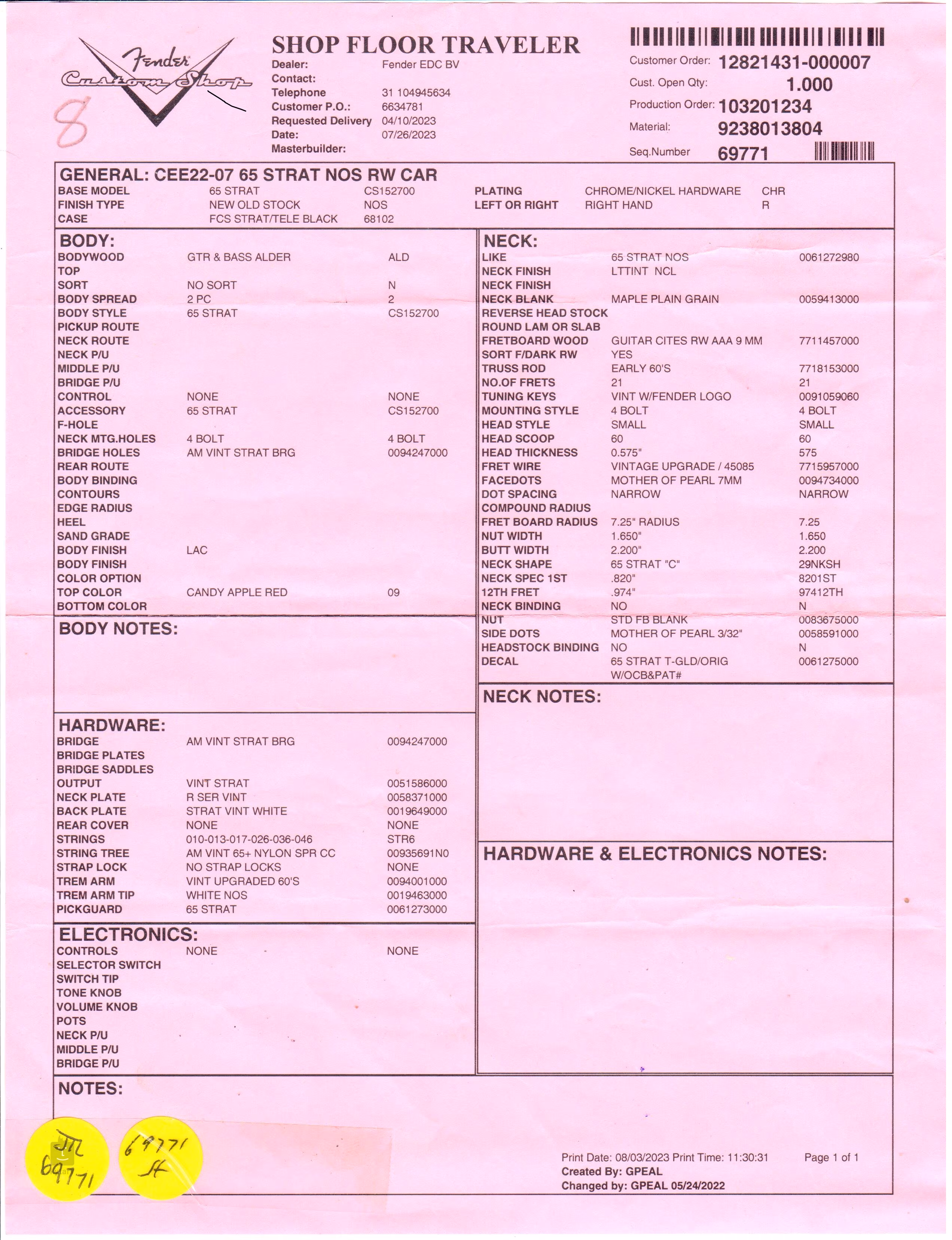 Telo tohto stratocastera je vyrobené z dvoch kusov výberovej jelše. K javorovému krku s profilom 65 Strat C je prilepený palisandrový hmatník kvality AAA osadený dvadsaťjeden pražcami veľkosti Vintage Upgrade (45085). Zodpovedajúci stratový tón a pocit z hry zabezpečujú tri single-coil snímače Custom Shop 65 Strat. Charakter zvuku si môžete nastaviť pomocou potenciometrov hlasitosti, tónovej clony a päťpolohového prepínača snímačov. Struny sú ukotvené pomocou ladiacich mechaník vo vintage štýle a synchronizovaného stratovského tremola prostredníctvom kosteného hmatníka.