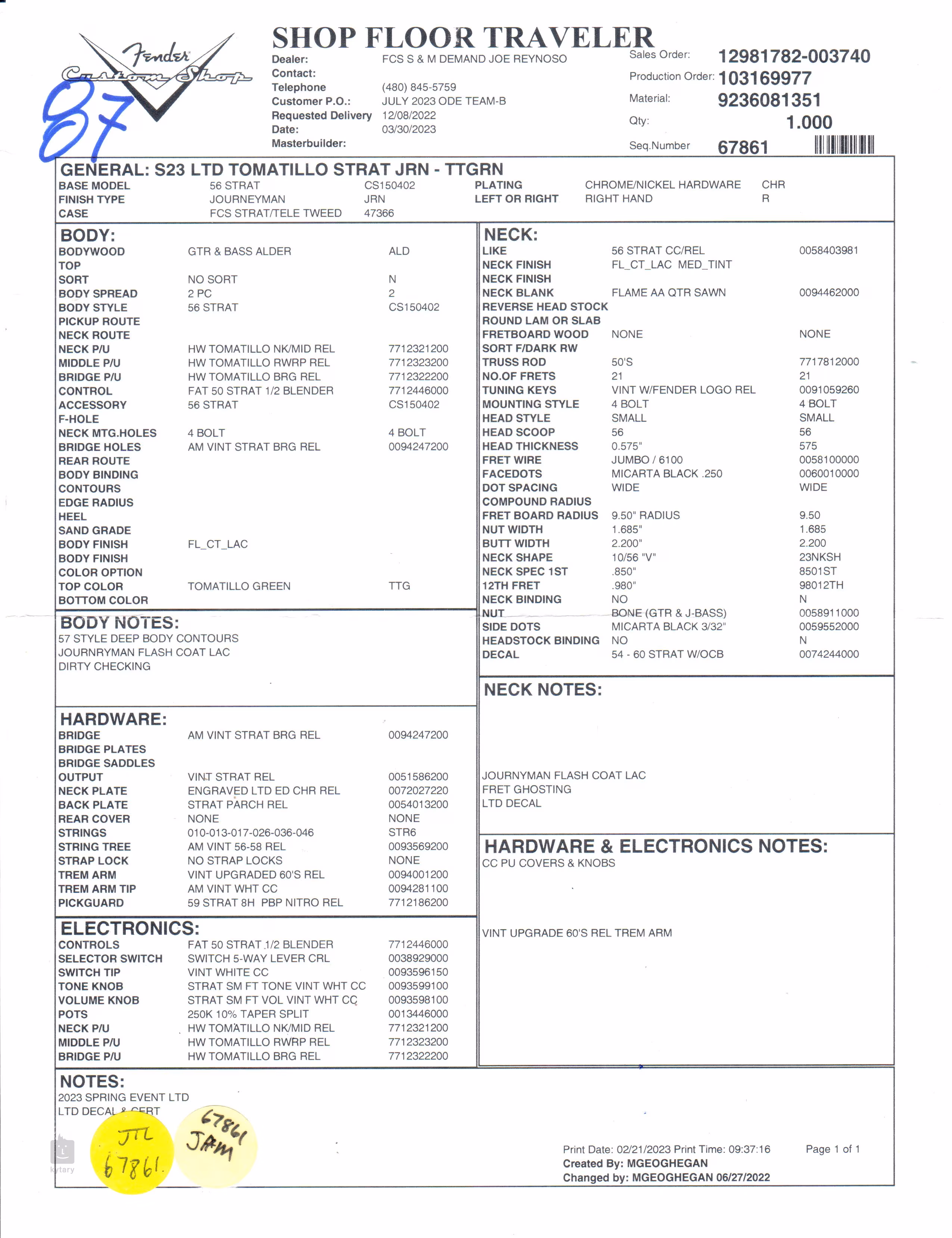 Telo gitary je vyrobené z dvoch kusov jaseňa. Povrchová úprava Journeyman Relic Tomatillo Green ponúka prvky falošnej patiny, ktorá zodpovedá desaťročiam bežného, skôr domáceho používania. Kvalitný figúrovaný javorový krk 2A (Quartersawn) s profilom 10/56 "V" je osadený dvadsaťjeden jumbo (6100) pražcami.