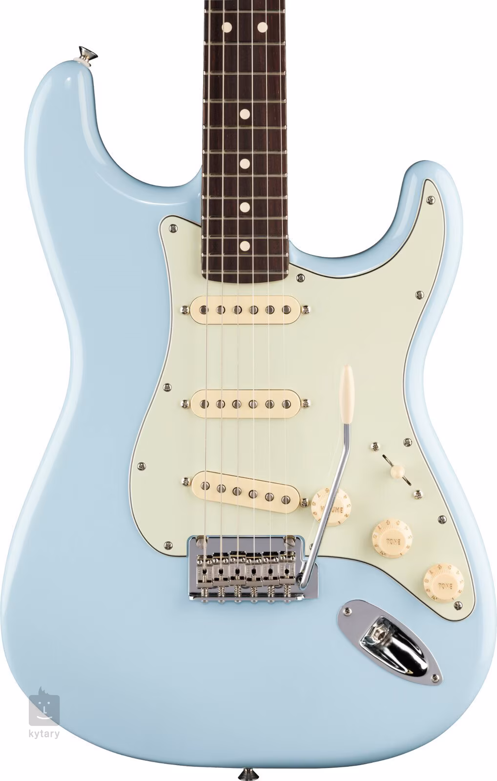 Tri snímače Player Series single-coil s magnetmi Alnico 5 dodávajú gitare modernejší pocit a zvuk Fender, ktorý oceníte v širokej škále hudobných štýlov. Charakter zvuku je možné nastaviť pomocou ovládačov hlasitosti a tónu a päťpolohového prepínača snímačov. Struny sú ukotvené v ladiacich mechanikách ClassicGear s prevodovým pomerom 18:1 a synchronizovaným „2-bodovým“ tremolom s oceľovými sedlami. Štýlový vzhľad gitary dotvára trojvrstvový chránič Mint Green a povrchová úprava Sonic Blue.