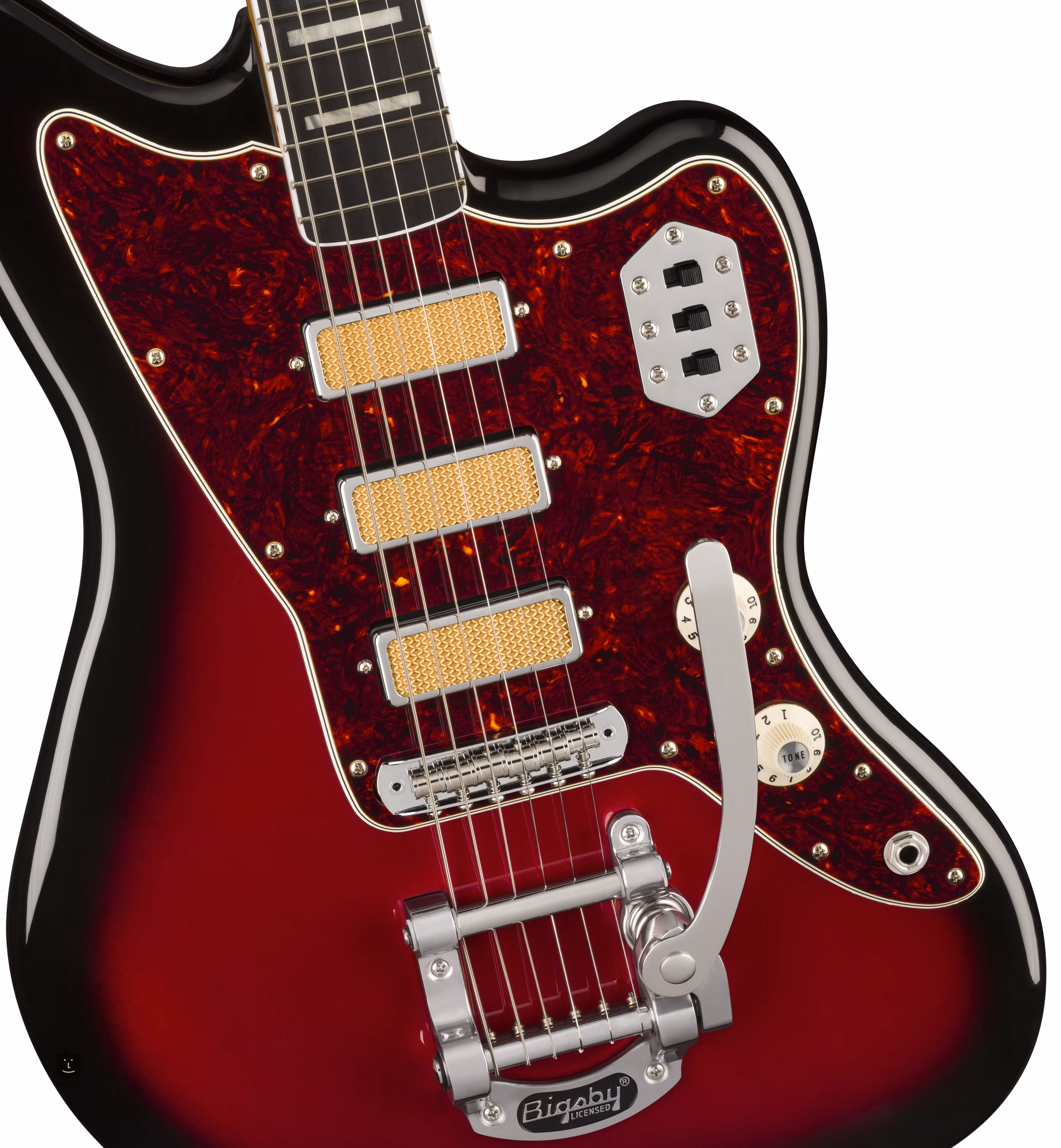 Tri mini humbuckery Gold Foil dodávajú gitare autentický zvuk a pocit z hry značky Fender. Jej charakter upravíte pomocou potenciometrov hlasitosti a tónovej clony a jednotlivé snímače aktivujete pomocou troch prepínačov On/Off. Struny sú ukotvené v ladiacich mechanikách vo vintage štýle a licencovanom tremole Bigsby B50. Štýlové spracovanie podčiarkuje zvolená farebná schéma, pickguard s imitáciou korytnačiny a logo spoločnosti na typickej hlave Fender.