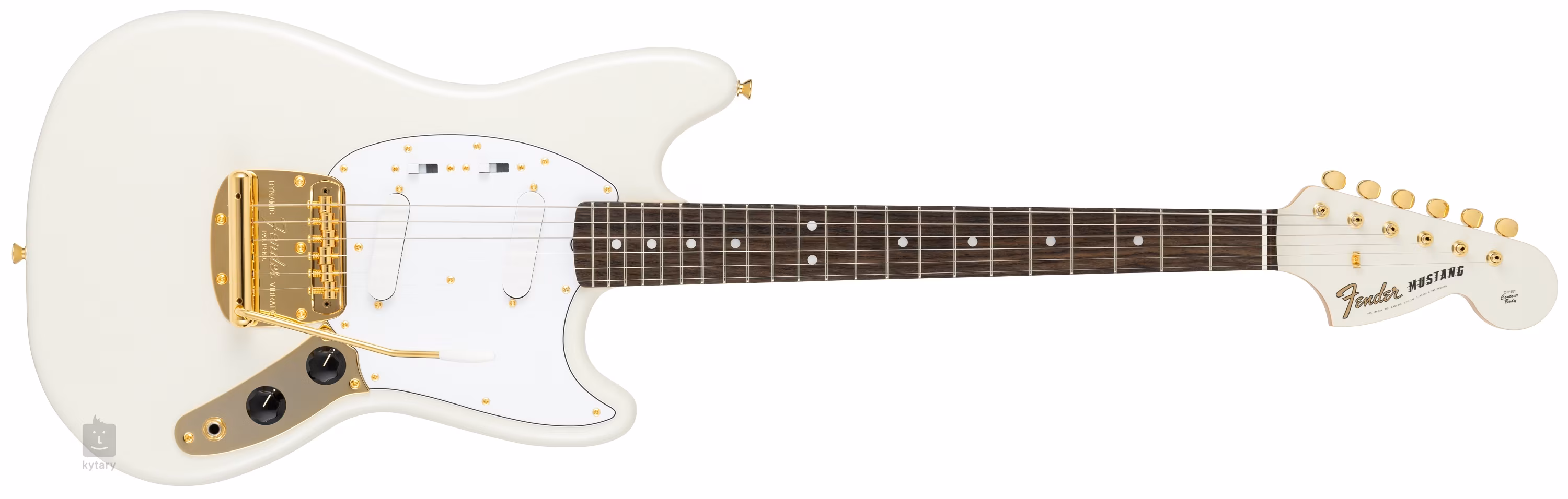 Dvojica snímačov typu single-coil vo vintage štýle dodáva gitare hrejivý zvuk a pocit s jasne priznanou DNA značky Fender. Kontúry zvuku upravíte pomocou ovládačov hlasitosti a tónovej clony. Dvoma miniprepínačmi je možné aktivovať jednotlivé snímače a zároveň si vybrať medzi ich zapojením do alebo mimo fázy. Struny sú uchytené naprieč kosteným hmatníkom vo firemných ladiacich mechanikách vo vintage štýle a v dynamickom vibrate/mustang tremolo, t. j. plávajúca kobylka je súčasťou dynamického vibrata. Štýlové spracovanie podčiarkuje zlatý hardvér a biely trojvrstvový pickguard.