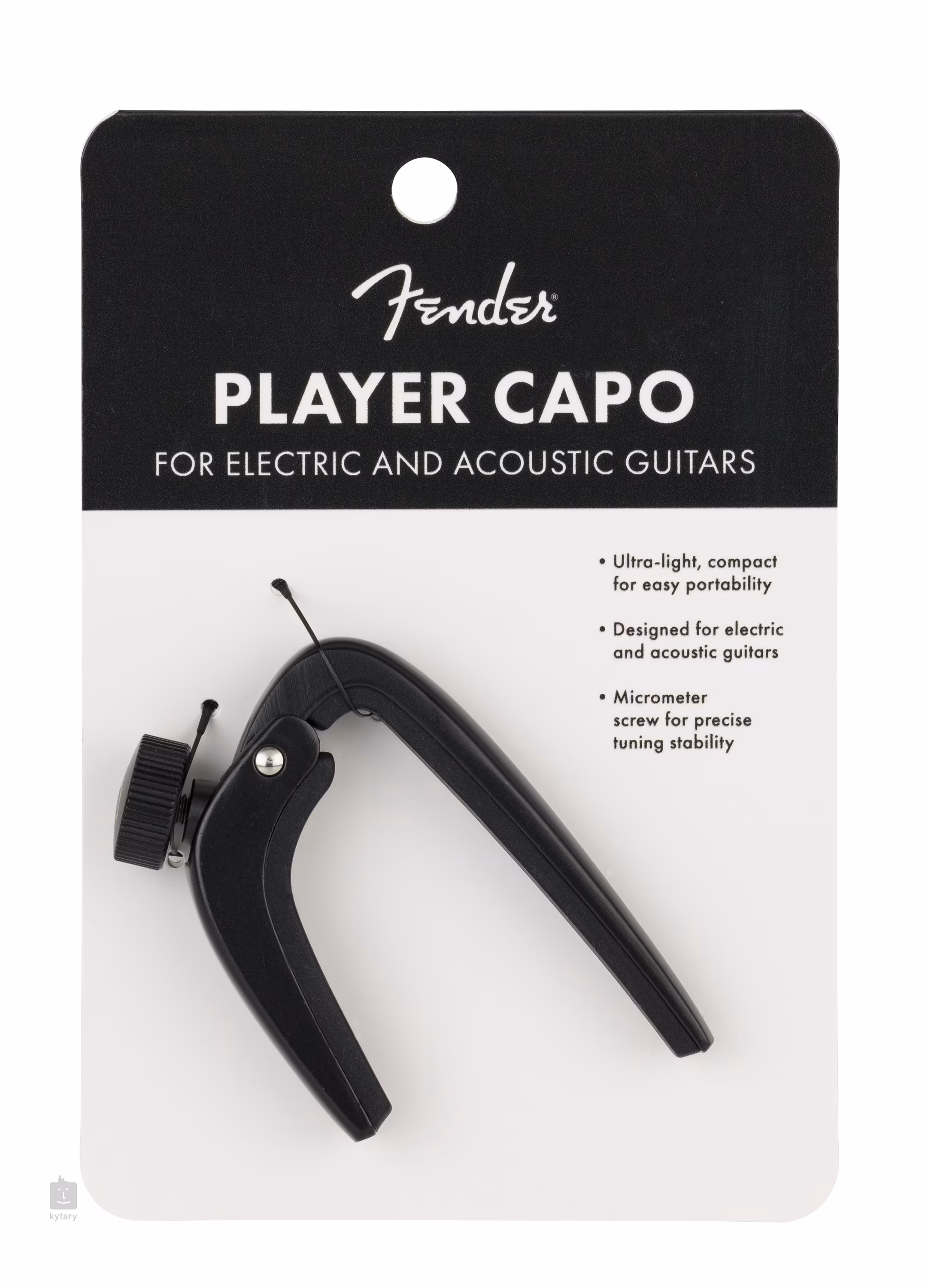 Tento kapodaster zo série Fender Player Capo je vhodný pre väčšinu akustických a elektrických gitár s úzkym, zaobleným hmatníkom. Ide o spoľahlivý a cenovo dostupný model s uťahovacou skrutkou, ktorá umožňuje presné nastavenie tlaku na struny, čím zabezpečuje precíznu intonáciu a eliminuje nežiaduce bzučanie a podtóny strún. Kapodaster je veľmi ľahký a ponúka elegantný, nenápadný dizajn. V mieste kontaktu s krkom a hmatníkom má mäkký pogumovaný povrch, ktorý je šetrný k povrchu nástroja, takže sa nemusíte obávať jeho poškriabania. Skrátka spoľahlivý nástroj pre hráčov všetkých úrovní.