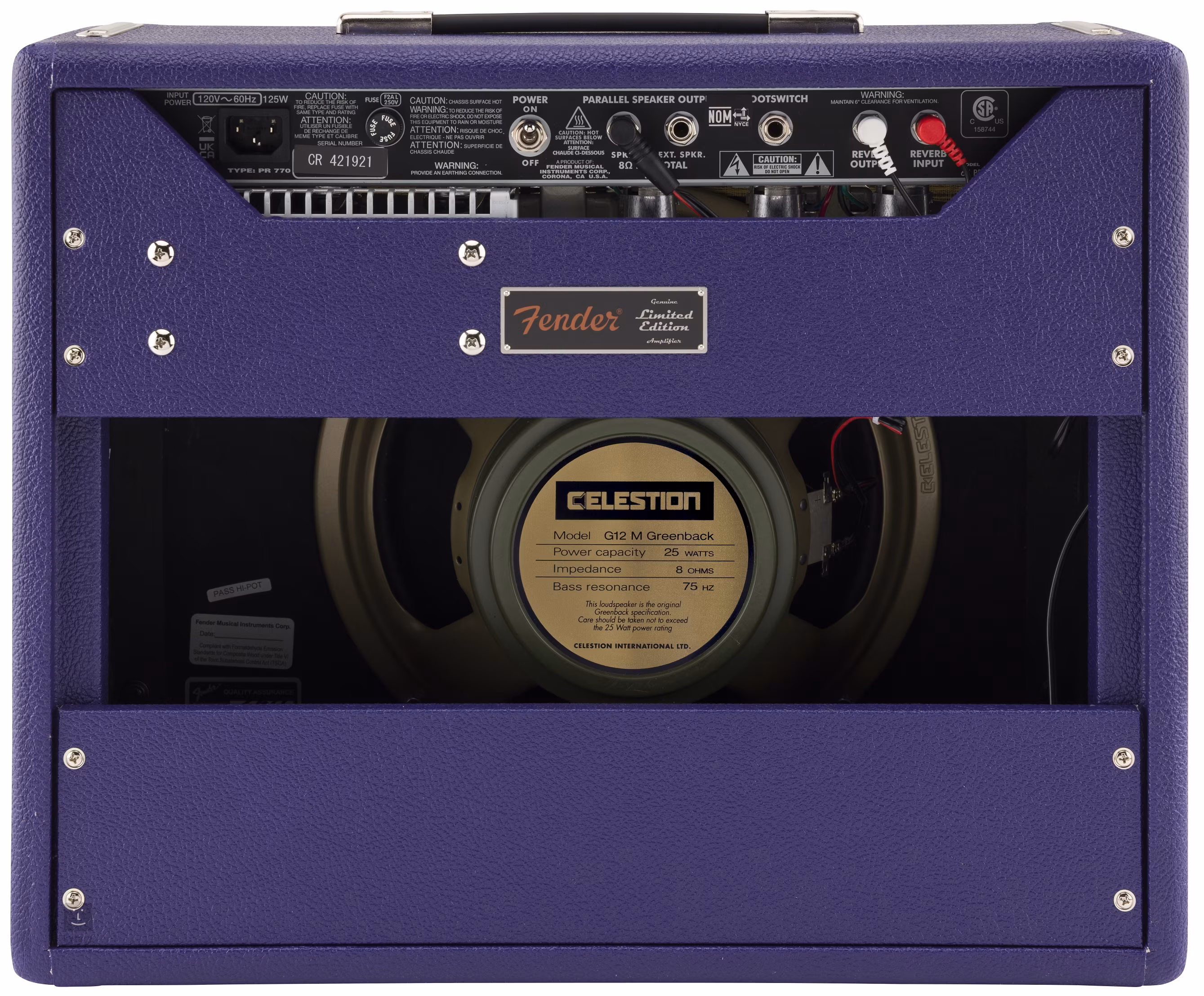 Limitovaná edícia modelového komba FSR Princeton Reverb Plum prichádza v štýlovom novom dizajne, v ktorom dominuje fialový Tolex a pšeničná farba mriežky reproduktora. V porovnaní s pôvodnou verziou je vybavený aj 12-palcovým reproduktorom Celestion Greenback, ktorý je obľúbený okrem iného aj Angusom Youngom z AC/DC. Reproduktor má zdôraznené stredy, obmedzené výšky a stabilné basy, čím vytvára výrazný, kontrolovaný tón. Skratka FSR v názve komba znamená sériu Fender Special Run, ktorú vyvinuli konštruktéri spoločnosti Fender, ktorí experimentovali s rôznymi komponentmi populárnych produktov, aby im dodali jedinečné inovatívne vlastnosti a charakteristiky.