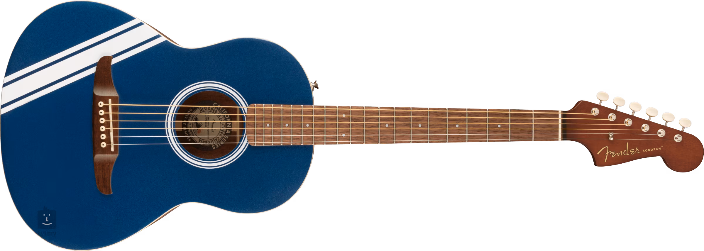 Sonoran Mini Lake Placid Blue w/Competition Stripes je akustická gitara z limitovanej edície značky (Fender Special Run). Predná doska nástroja je vyrobená z laminovaného smreku, zatiaľ čo zadná doska a luby sú z laminovaného mahagónu. Ku krku nato je prilepený orechový hmatník s osemnástimi pražcami a orientáciu uľahčujú biele polohové bodky. Struny sú uchytené cez nultý pražec NuBone vo firemnej 6-in-line kobylke s bielymi plastovými kolíkmi a orechovým hmatníkom. Pekné spracovanie podčiarkuje povrchová úprava Lake Placid Blue w/Competition Stripes, rozeta zložená z čiernych a bielych krúžkov a logo na hlavici.