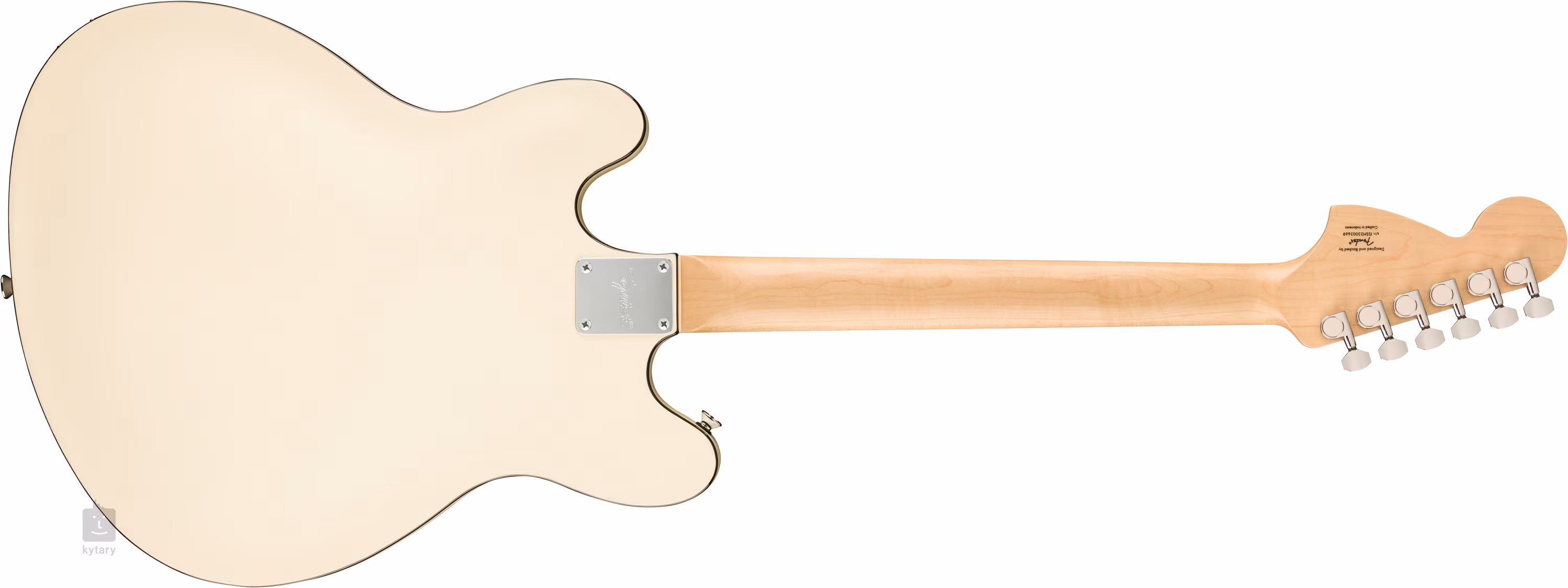 Asymetrické klenuté poloduté telo Affinity Series Starcaster Deluxe Olympic White je skonštruované z laminovaného javora a stredového bloku, ktorý spevňuje rezonančnú dosku. Skrutkovaný javorový krk s "hráčsky prívetivým" C profilom je prilepený k figovému hmatníku osadenému dvadsiatimi dvoma Medium Jumbo pražcami. Orientáciu na hmatníku uľahčujú polohové bodky imitujúce perleť.