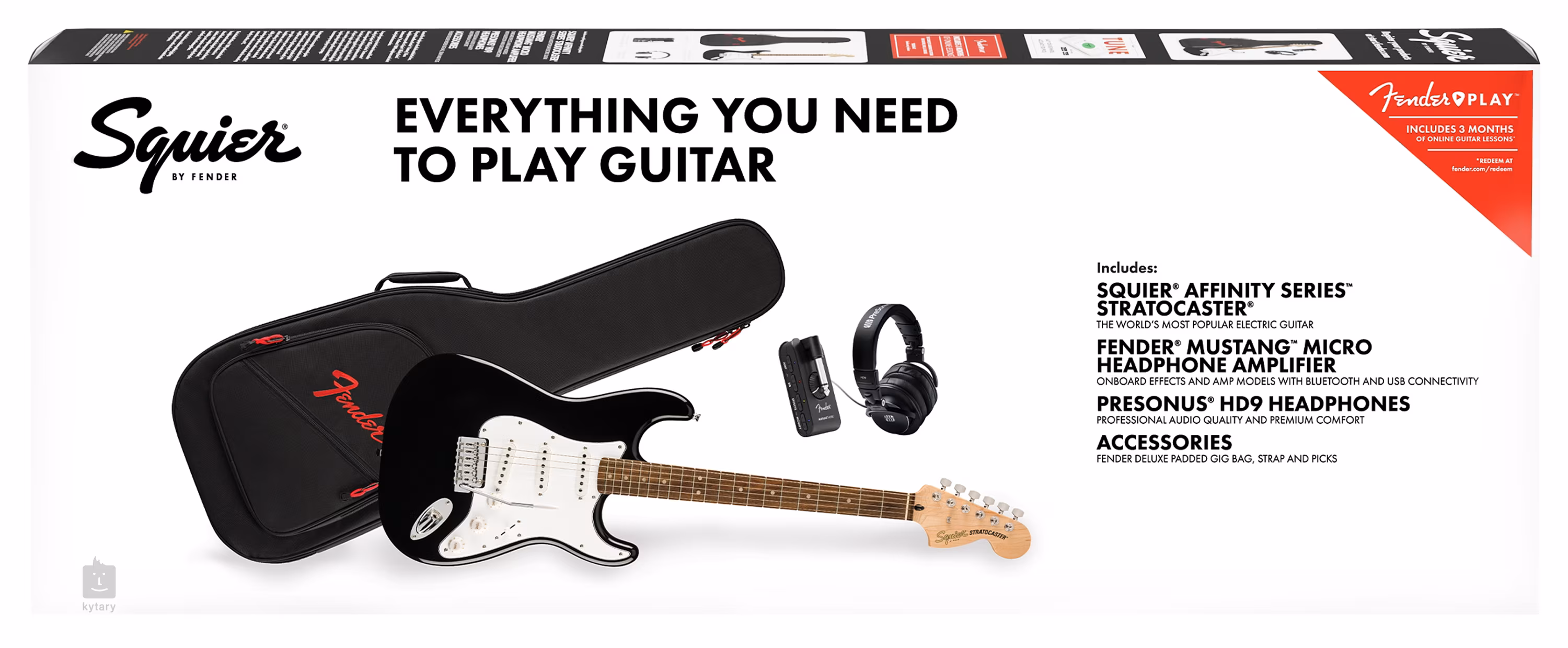 Gitarový set Affinity Series Stratocaster Mustang Micro Pack Black HD9 (US, CA, EU, AU, JP) obsahuje elektrickú gitaru Fender Squier Affinity Stratocaster, slúchadlový zosilňovač Mustang Micro, slúchadlá PreSonus HD9, polstrované puzdro, gitarový pás, trsátka a bezplatný prístup do služby Fender Play na tri mesiace.