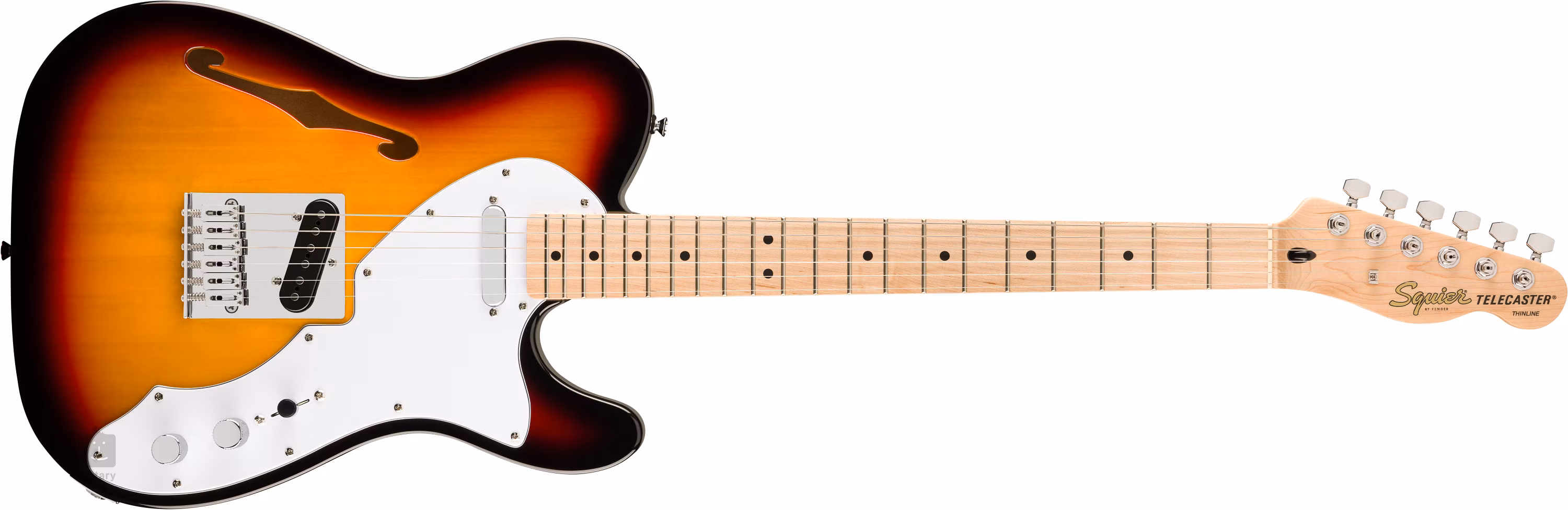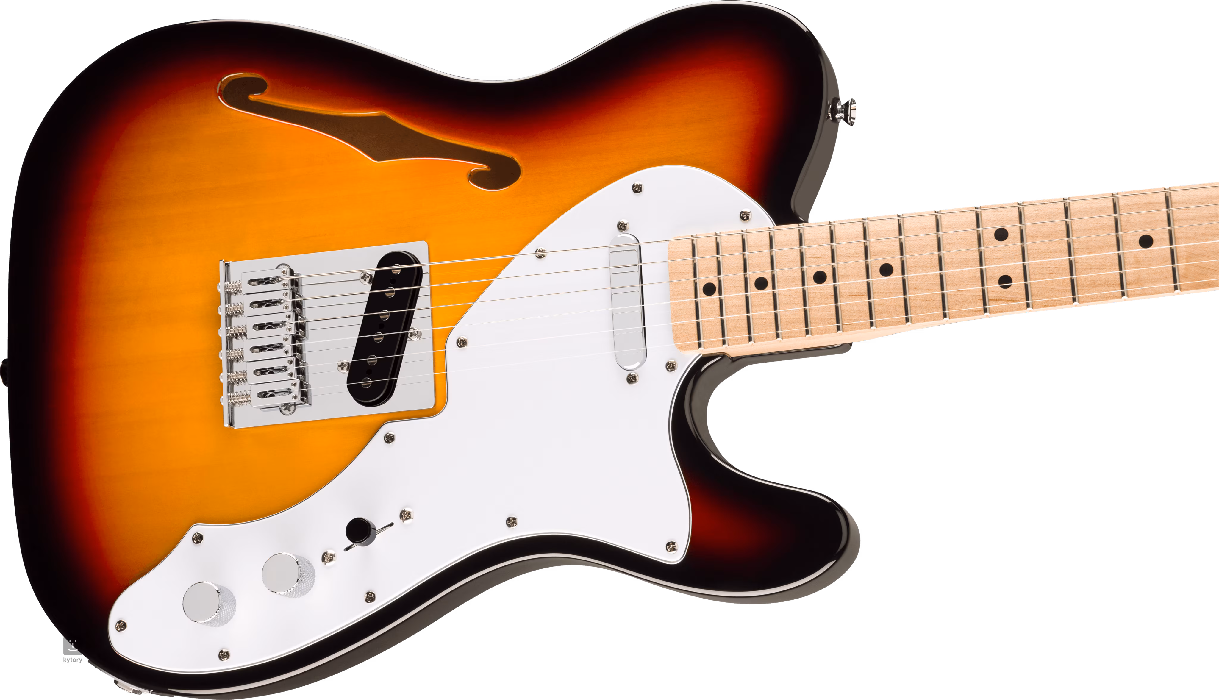 Gitara Affinity Series Telecaster Thinline 3-Color Sunburst má užšie odľahčené komorované topoľové telo s F výrezom. Javorový hmatník osadený dvadsaťjeden Medium Jumbo pražcami je prilepený na skrutkovaný javorový krk s pohodlným "C" profilom. Čierne polohové bodky na hmatníku uľahčujú orientáciu.