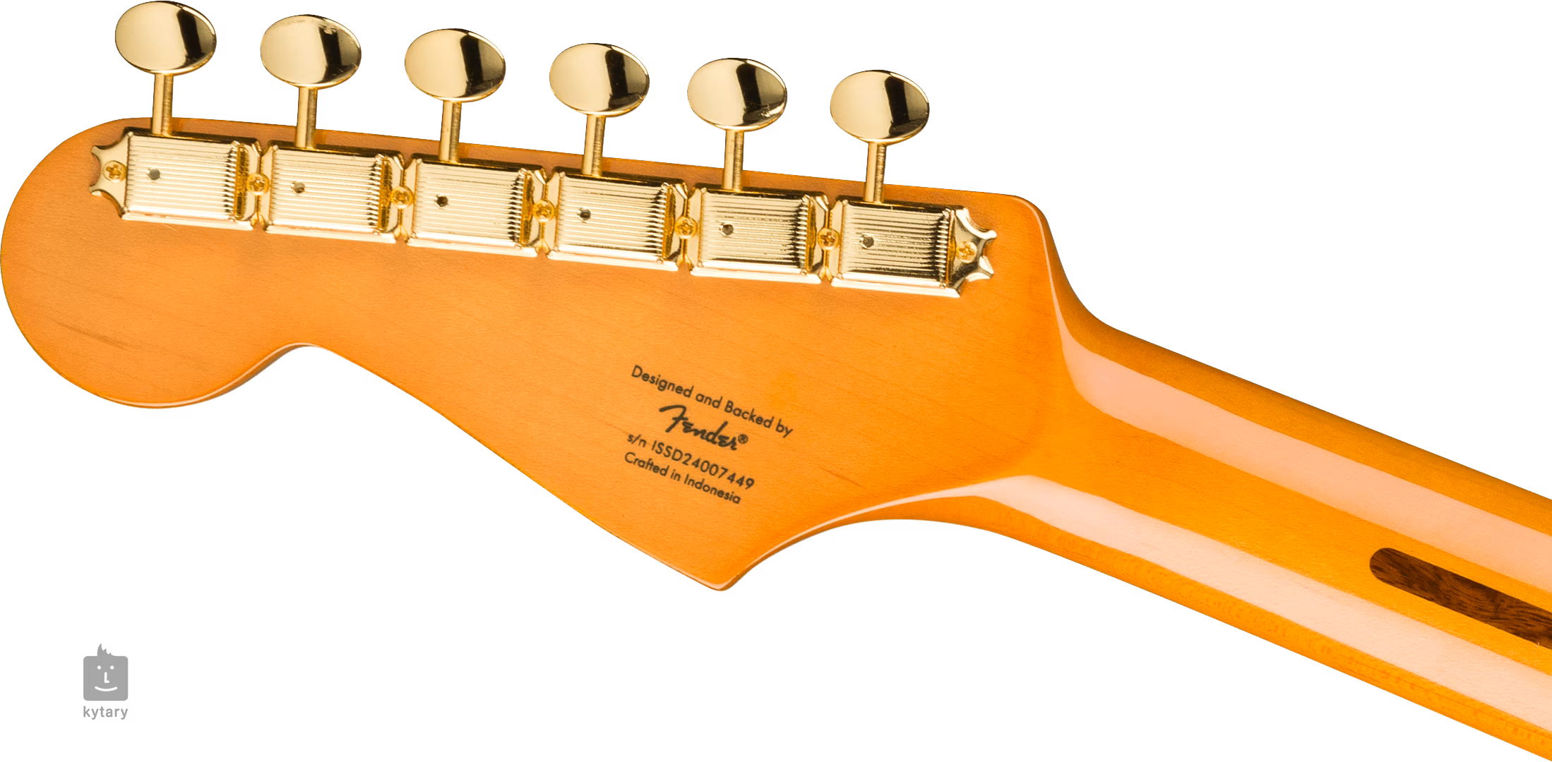 Tri patentované single-coil snímače s Alnico magnetmi dodávajú gitare zvuk s autentickým charakterom Fender. Na úpravu nastavení slúži potenciometer hlasitosti, dva tónové ovládače a päťpolohový prepínač snímačov. Struny sú osadené firemnou mechanikou vo vintage štýle a tradičným synchronizovaným tremolom. Štýlový vzhľad tohto limitéra podčiarkuje zlatý hardvér a jednovrstvový pickguard.