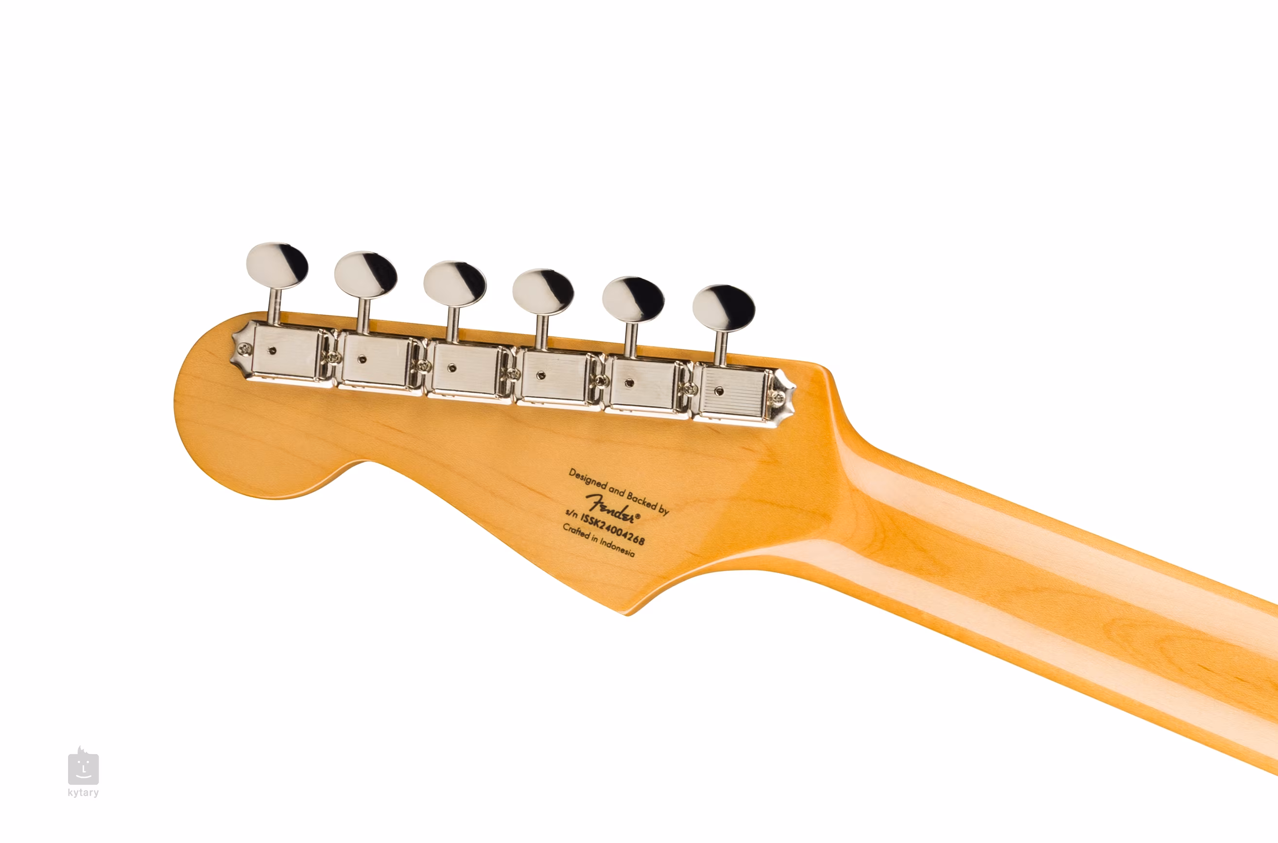 Tri patentované snímače typu single-coil s magnetmi Alnico dodávajú gitare autentický zvuk a pocit Strat. Charakter zvuku si môžete upraviť pomocou štandardných ovládacích prvkov. Struny sú osadené firemnými synchronizovanými tremolo snímačmi vo vintage štýle. Štýlový vzhľad gitary podčiarkuje štvorvrstvový pickguard s imitáciou korytnačiny, niklový hardvér a logo Squier by Fender na hlavici.
