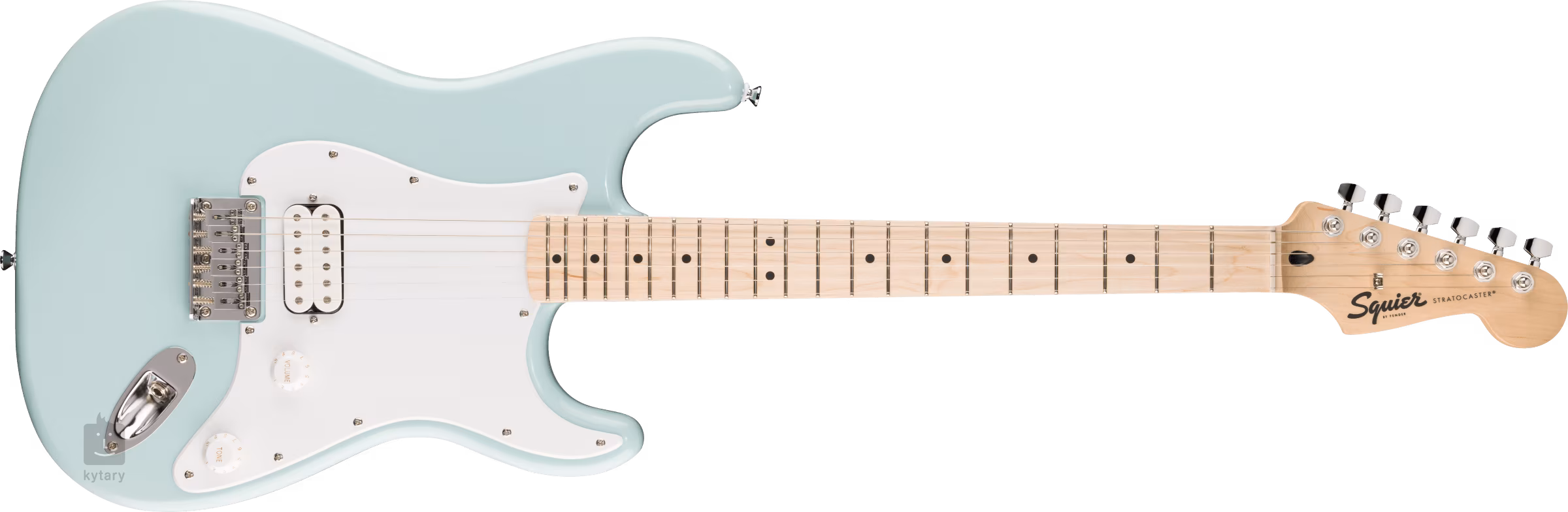 Keramický humbuckerový snímač na mostíku dodáva gitare plný, šťavnatý zvuk, ktorý sa určite nestratí v rockovej hudbe a mnohých ďalších štýloch. Zvukové kontúry môžete nastaviť pomocou ovládačov hlasitosti a tónu. Struny sú ukotvené v liatinových ladiacich mechanikách spoločnosti a pevnom mostíku so šiestimi sedlami (6-Saddle Top-Load Hardtail). Štýlový dizajn Strat zdôrazňuje chrómový hardvér, biely jednovrstvový pickguard a logo spoločnosti na hlave.