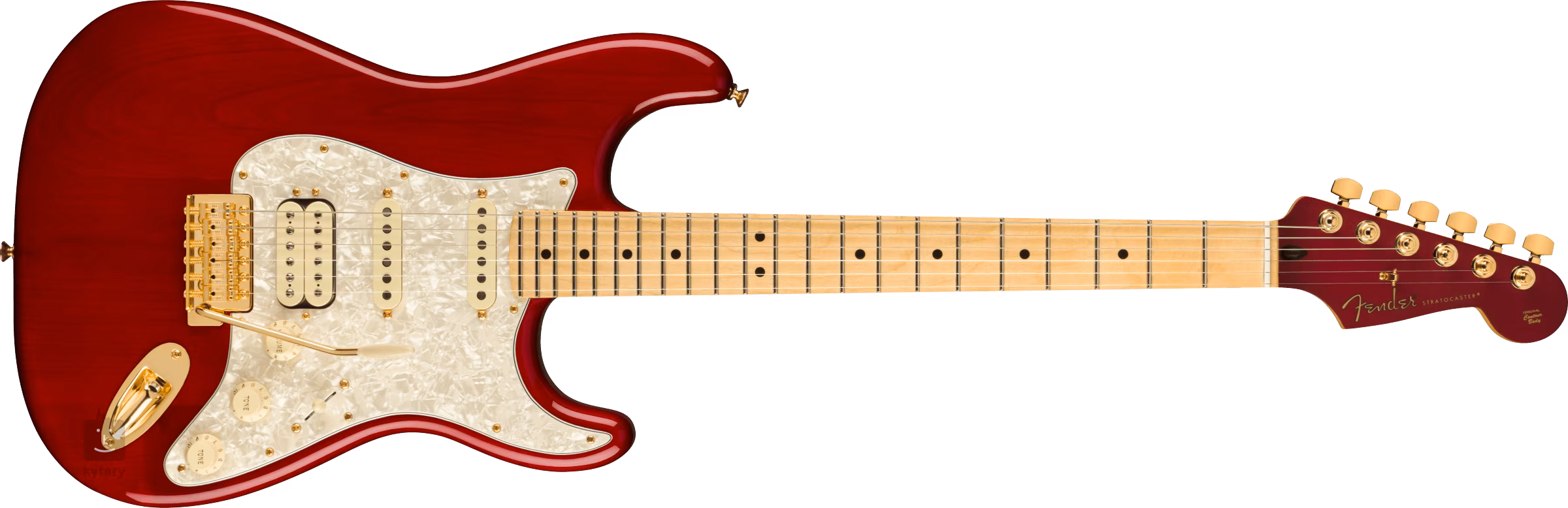 Struny sú ukotvené prostredníctvom kosteného hmatníka v patentovanej mechanike spoločnosti (Standard Cast/Sealed) a synchronizovaného tremola so šesťbodovým uchytením. Štýlové prevedenie podčiarkuje farebná úprava Transparent Cherry, trojvrstvový perleťový pickguard a zlatý hardvér.