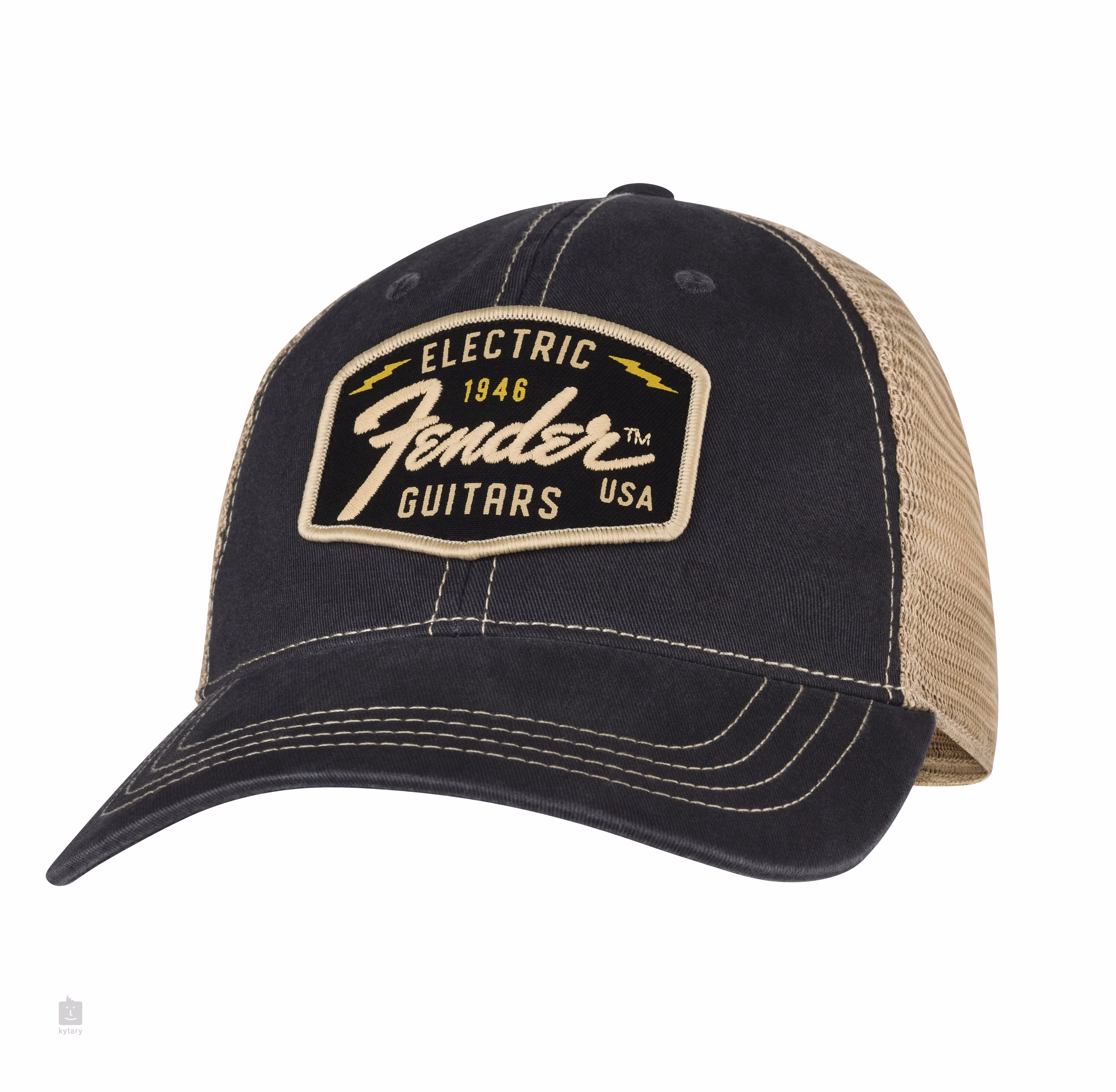 Fender Transition Logo Patch Hat Black/Stone s keprovou prednou časťou a priedušnou sieťovinou vzadu. Veľkosť je ľahko nastaviteľná - "jedna veľkosť padne väčšine".