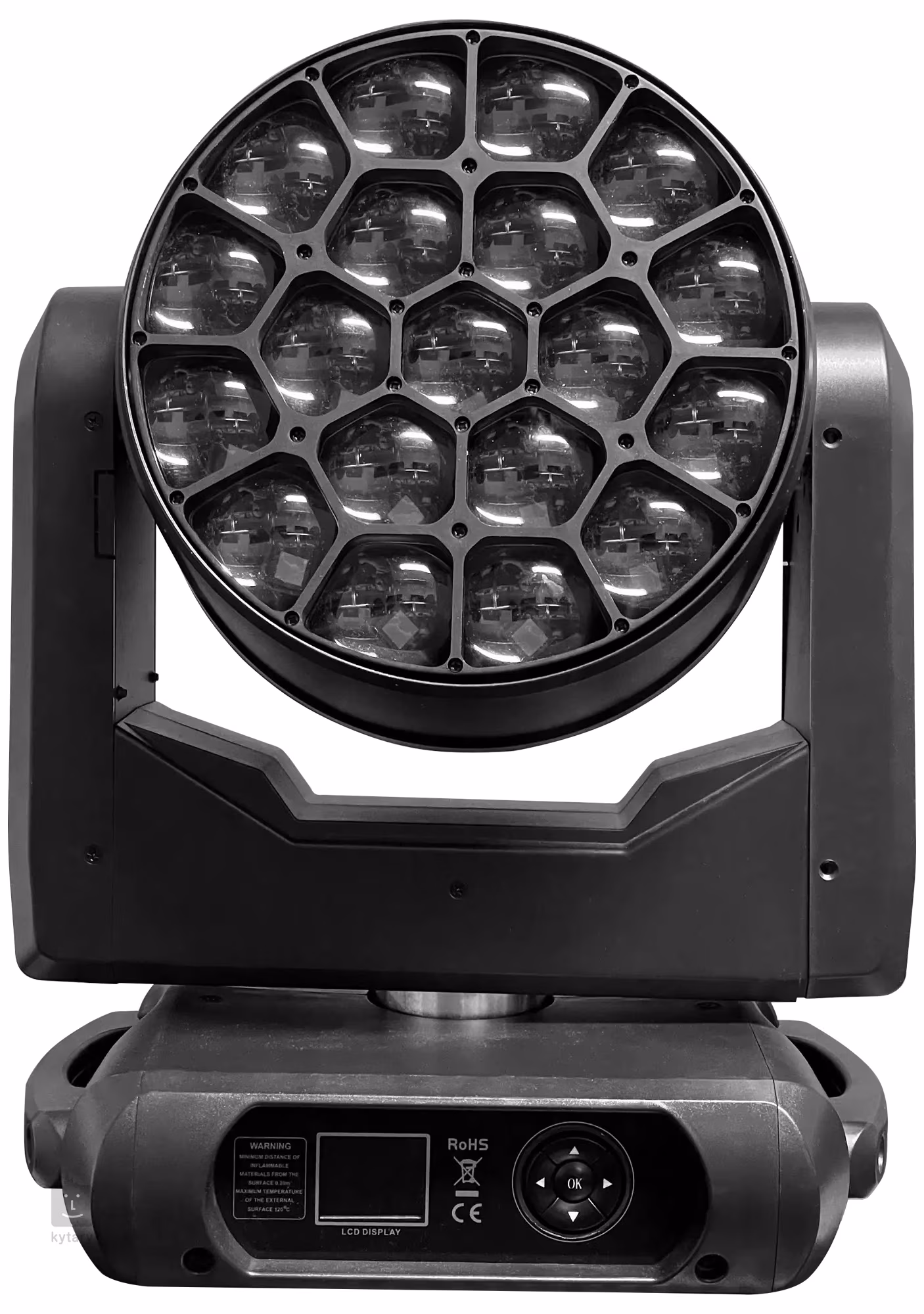 Hlavním zdrojem světla je devatenáct 15W RGBW LED diod, které vám umožní vytvářet bohaté barevné kombinace. K dispozici je také elektronický stmívač světla a stroboskopický efekt s nastavitelnou rychlostí blikání. Svítidlo je zároveň vybaveno funkcí zoom s rozsahem 3,5 – 60°, díky čemuž dokáže vytvořit jak soustředěný paprsek, tak široký kužel světla, což rozšiřuje jeho možnosti použití. Samozřejmostí je funkce Pan 540° a Tilt 270° pro bezproblémový pohyb hlavy do všech směrů.