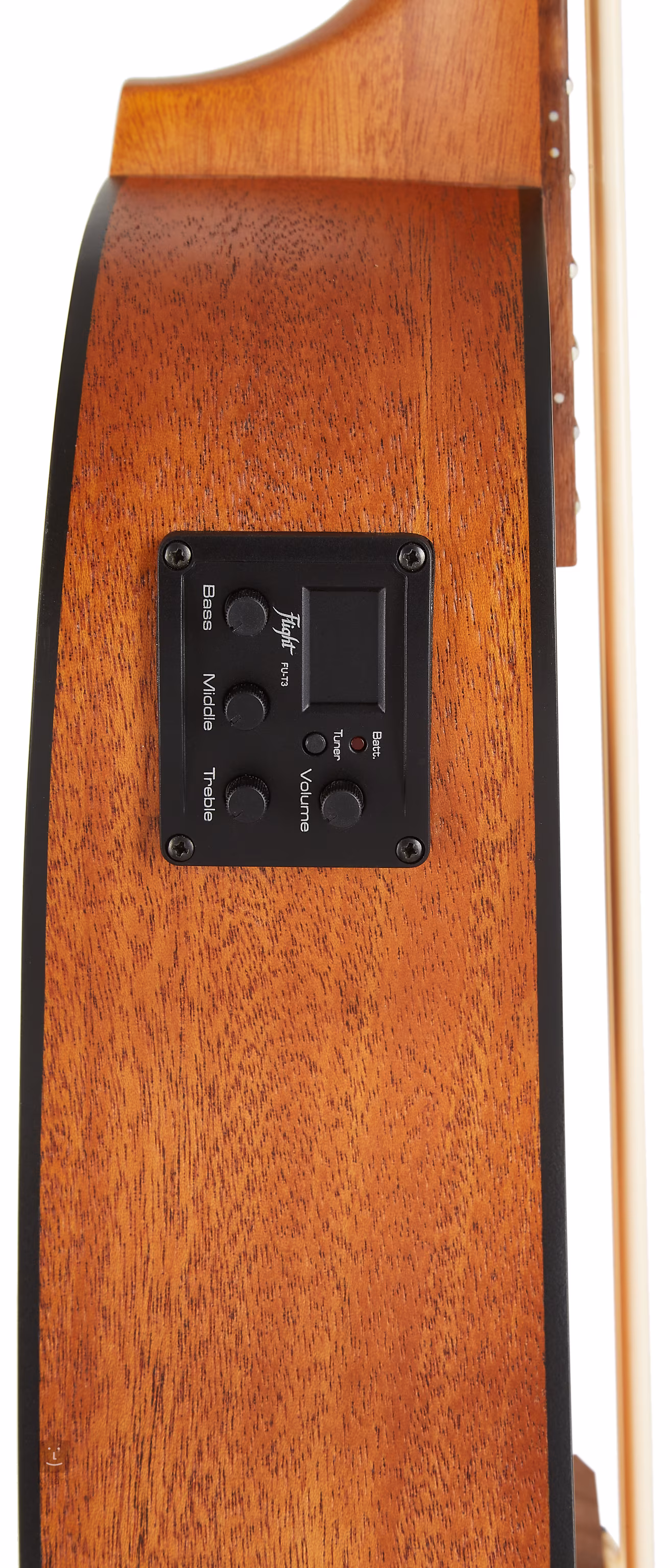 V širokej ponuke značky Flight nájdete aj model basového ukulele. Telo tohto nástroja je vyrobené z laminovaného mahagónu. Krk a hmatník sú vyrobené z afrického okoumé a orechového dreva, čo je tiež pomerne často používaná kombinácia drevín. Struny sú ukotvené v ladiacich mechanikách (Geared) a orechovom hmatníku nad kosteným pražcom a sedlom.