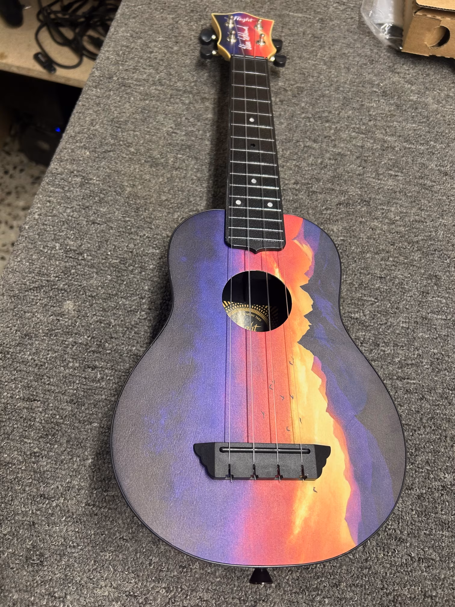 Telo tohto sopránového signature modelu mladej hráčky na ukulele Elise Ecklund pozostáva z plastového tela a laminovanej lipovej rezonančnej dosky, ktorú zdobí farebný motív západu slnka. Širšia klenutá zadná doska ukulele umožňuje nástroju rezonovať jasnejším a hlasnejším zvukom ako štandardné sopránové modely. Krk a hmatník sú tiež vyrobené z plastového materiálu ABS, pričom dizajn krku imituje textúru dreva. Struny sú ukotvené prostredníctvom plastového nultého a sedlového pražca v ladiacich mechanikách gitarového typu (Geared) a plastovej hlavici. Štýlový vzhľad nástroja podčiarkuje javorová dyha na hlavici, farebne zladená s povrchovou úpravou vrchnej dosky.