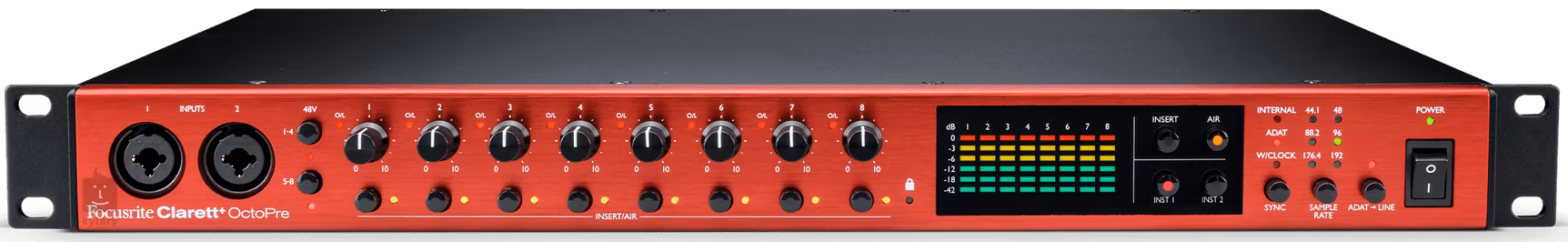 Focusrite Clarett Octopre je osmikanálový mikrofonní předzesilovač a AD / DA převodník s digitálním rozhraním ADAT. Špičkové předzesilovače řady Clarett pracují v rozlišení 24 bit / 192 kHz a nabízejí dynamický rozsah až 118 dB. AIR technologie, která dodává nahrávkám vzdušnost a průzračnost, emuluje impedanční a rezonanční charakteristiku legendárních analogových studiových předzesilovačů Focusrite ISA. Dva analogové vstupy umístěné na čelním panelu jsou schopny zpracovat mikrofonní i přímý nástrojový signál (Hi-Z).