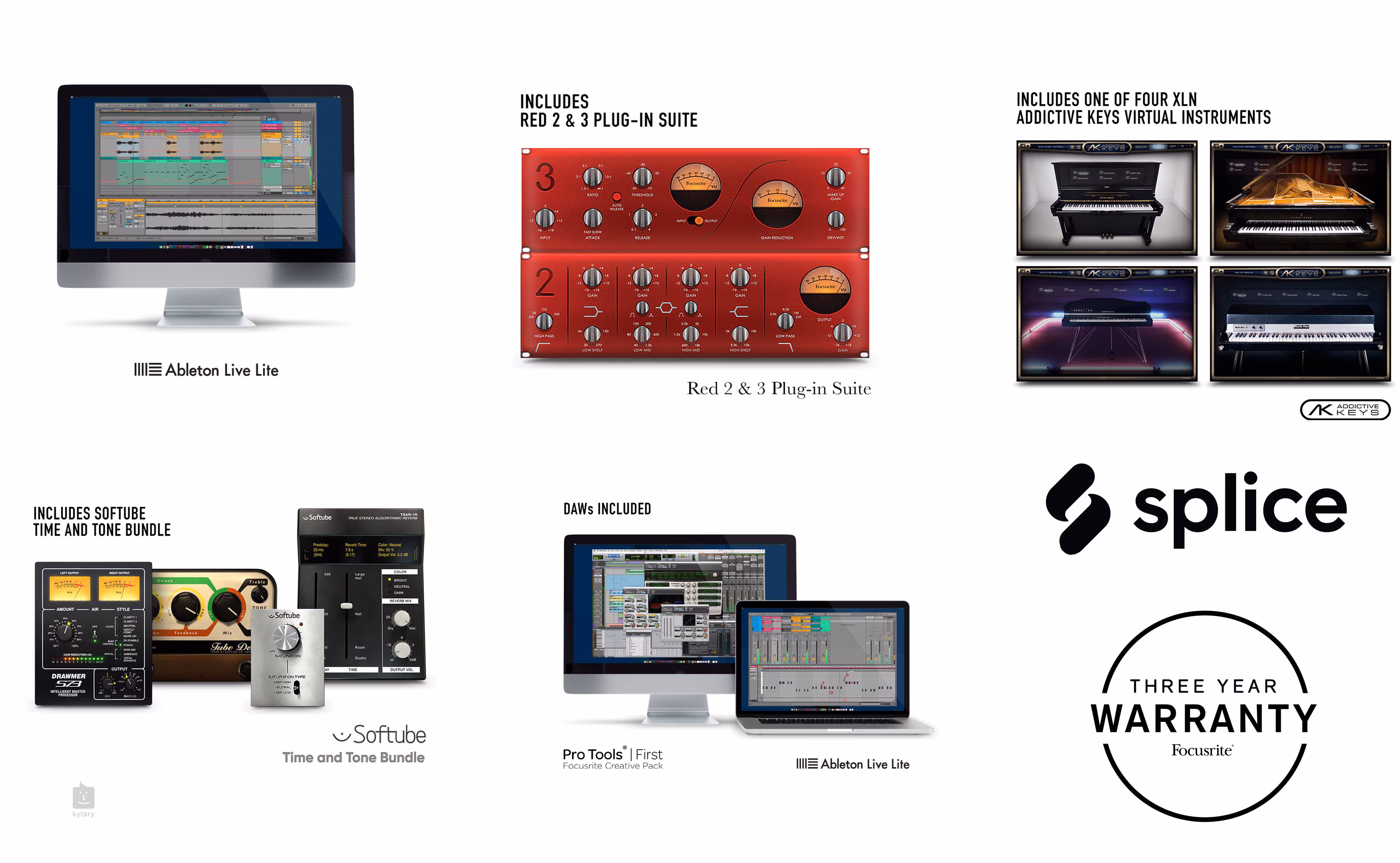 Průmyslový design s ovládacími prvky i elegantním šasi vyrobenými z kovu přináší odolnost a trvanlivost, jež se osvědčí při jakkoliv náročném použití. Nejnovější verze mikrofonních předzesilovačů Scarlett nabízí oproti dřívějšku vyváženější a širší průběh ovládacího potenciometru Gain, což umožňuje velmi plynulé nastavení vstupních úrovní. Podobným způsobem byl přepracován také nástrojový vstup, který si nyní poradí i s nejsilnějšími kytarovými snímači. Pro jistotu je analogová vstupní a výstupní sekce vybavena obvody, které zvukovou kartu ochrání před nežádoucími signálovými špičkami. Součástí balení je Ableton Live 10 Lite, Pro-Tools First l Focusrite Creative Pack, Focusrite Red 2 & 3 Plug-in Suite, Softube Time & Tone Bundle, XLN Audio Addictive Keys, Splice a Plug-In Collective.