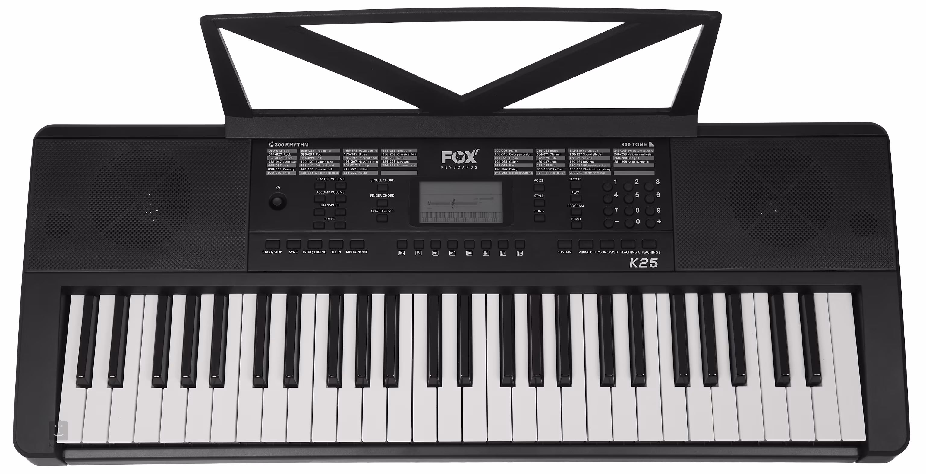 Klávesy FOX sú obľúbené predovšetkým vďaka svojmu bezkonkurenčnému pomeru ceny a výkonu a sú vhodné najmä pre začínajúcich hudobníkov a deti. Ponúkajú všetky základné funkcie potrebné na osvojenie si základov hudby a zoznámenie sa s rôznymi zvukovými farbami. A ak sa vaša vášeň pre hudbu nerozvinie, nemusíte sa obávať, že ste do svojho prvého nástroja investovali neprimerane vysokú sumu. FOX K25 ponúka 54 klávesov štandardnej veľkosti s dynamikou, 300 klasických a elektronických zvukov, osem bicích padov, 300 automatických sprievodov a 50 demo skladieb. K dispozícii sú aj pokročilé funkcie, ako napríklad Split (rozdelenie klávesnice na hranie dvoch nástrojov súčasne) a nastavenia Sustain (doznievanie) a Vibrato. Klávesnicu je možné transponovať, čo ocenia ako začiatočníci, tak aj pokročilí hráči. Samozrejme, môžete hrať akordy jedným prstom, používať funkciu Record na nahrávanie svojich pokusov alebo používať metronóm a výučbový systém. K klávesnici môžete pripojiť mikrofón alebo externé zariadenie s vašimi obľúbenými nahrávkami a hrať spolu s nimi.
