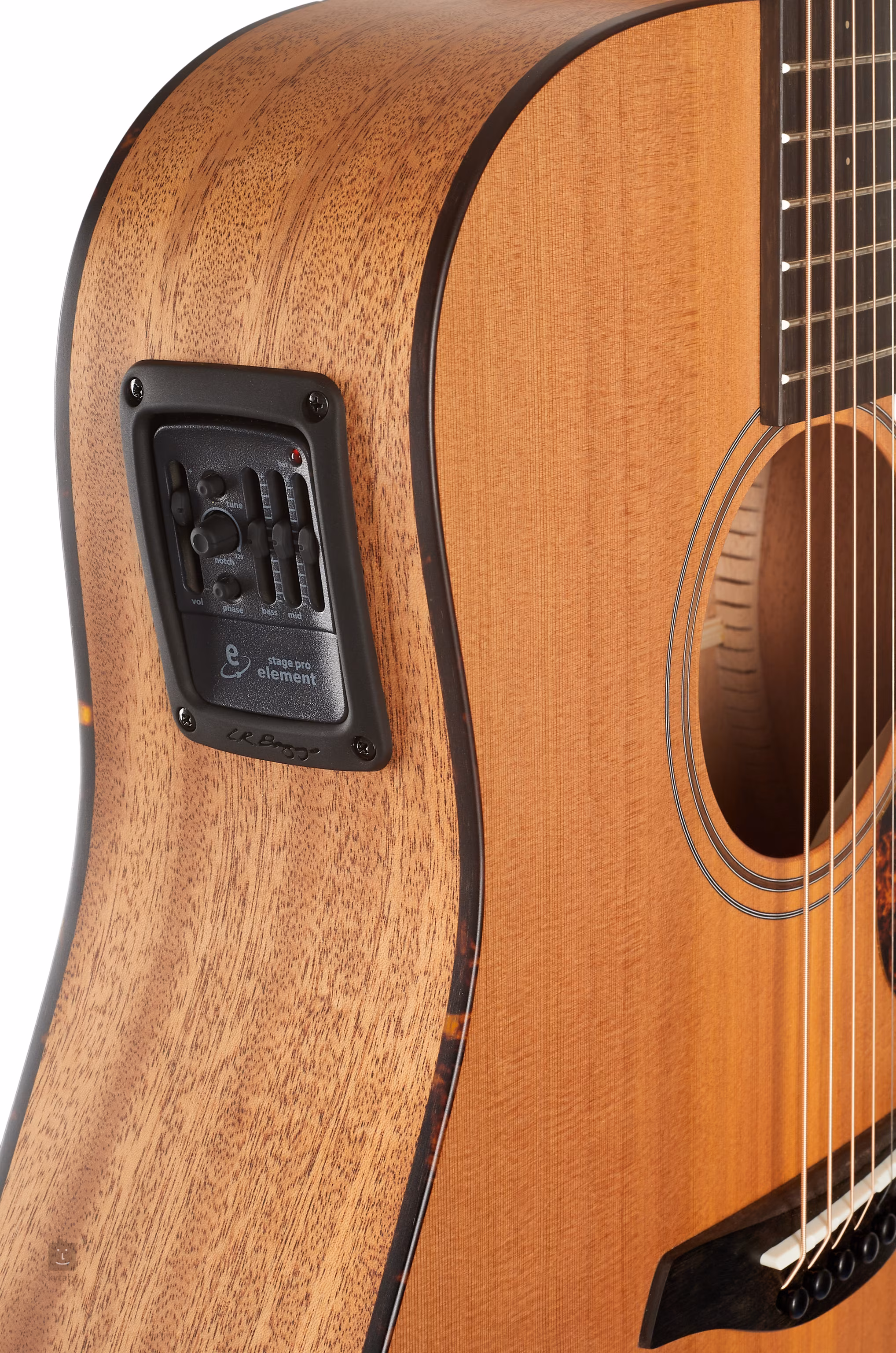 Vysokú kvalitu zvuku zabezpečuje aktívna elektronika LR Baggs Stagepro Element s trojpásmovým ekvalizérom, fázovým invertorom, notch filtrom na potlačenie spätnej väzby a integrovaným chromatickým ladičom.