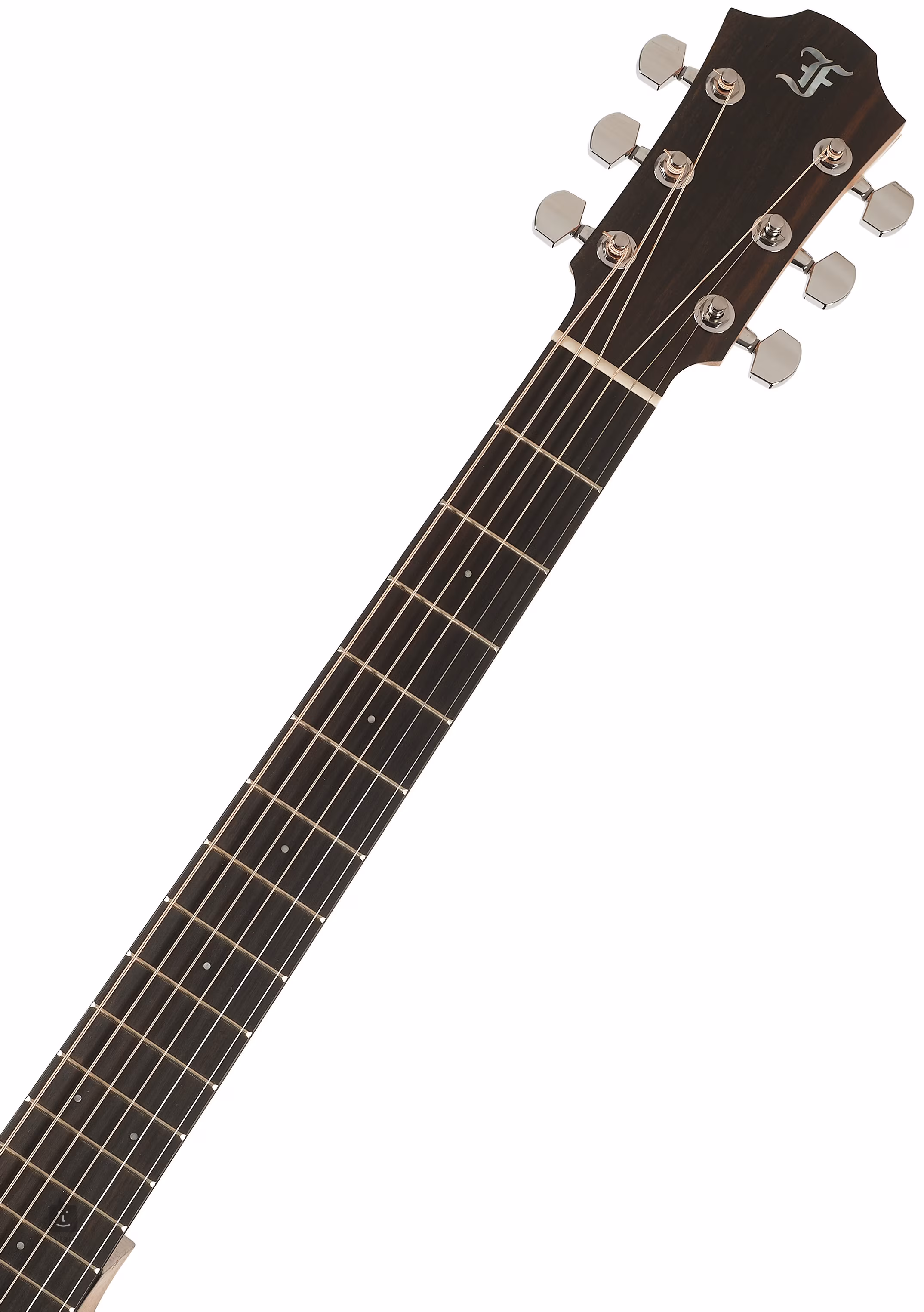 Orientáciu na ebenovom hmatníku uľahčujú predné bodové a bočné lineárne polohové značky z bielej perlete. Presné a stabilné ladenie zaručujú pochrómované firemné mechaniky s prevodovým pomerom 1:18. Štýlové spracovanie podčiarkuje rozeta pozostávajúca z dvojitého prstenca s intarziou z čierneho orecha, čierneho lemovania a čierneho pickguardu.