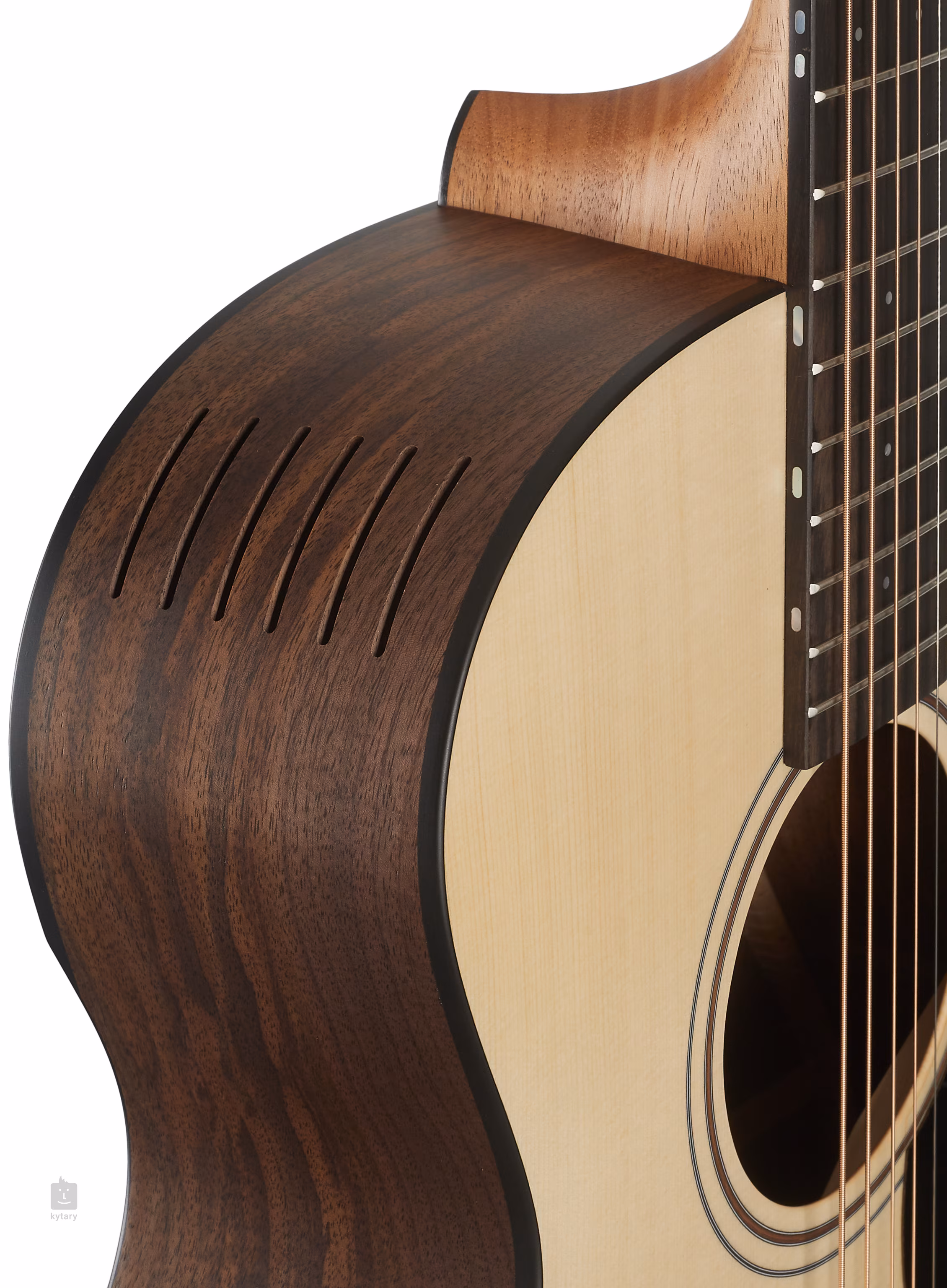 Orientaci na ebenovém hmatníku usnadňují čelní bodové a boční lineární poziční značky z bílé perleti. Přesné a stabilní ladění zaručují chromované firemní mechaniky s převodovým poměrem 1:18. Stylové zpracování podtrhuje rozeta tvořena dvojitým prstencem s vykládáním z černého ořechu, černá lemovka a černý pickguard.
