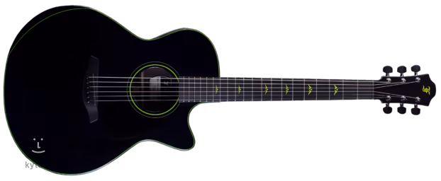 Elegantné limetkovozelené kvetinové intarzie a lineárne bočné značky polohy z bieleho perlete uľahčujú orientáciu na ebenovom hmatníku. Stabilné ladenie zaručujú špičkové ladiace mechaniky Gotoh 510 Cosmo Black s leštenými ebenovými kolíkmi a vysoko presným prevodovým pomerom 1:21.