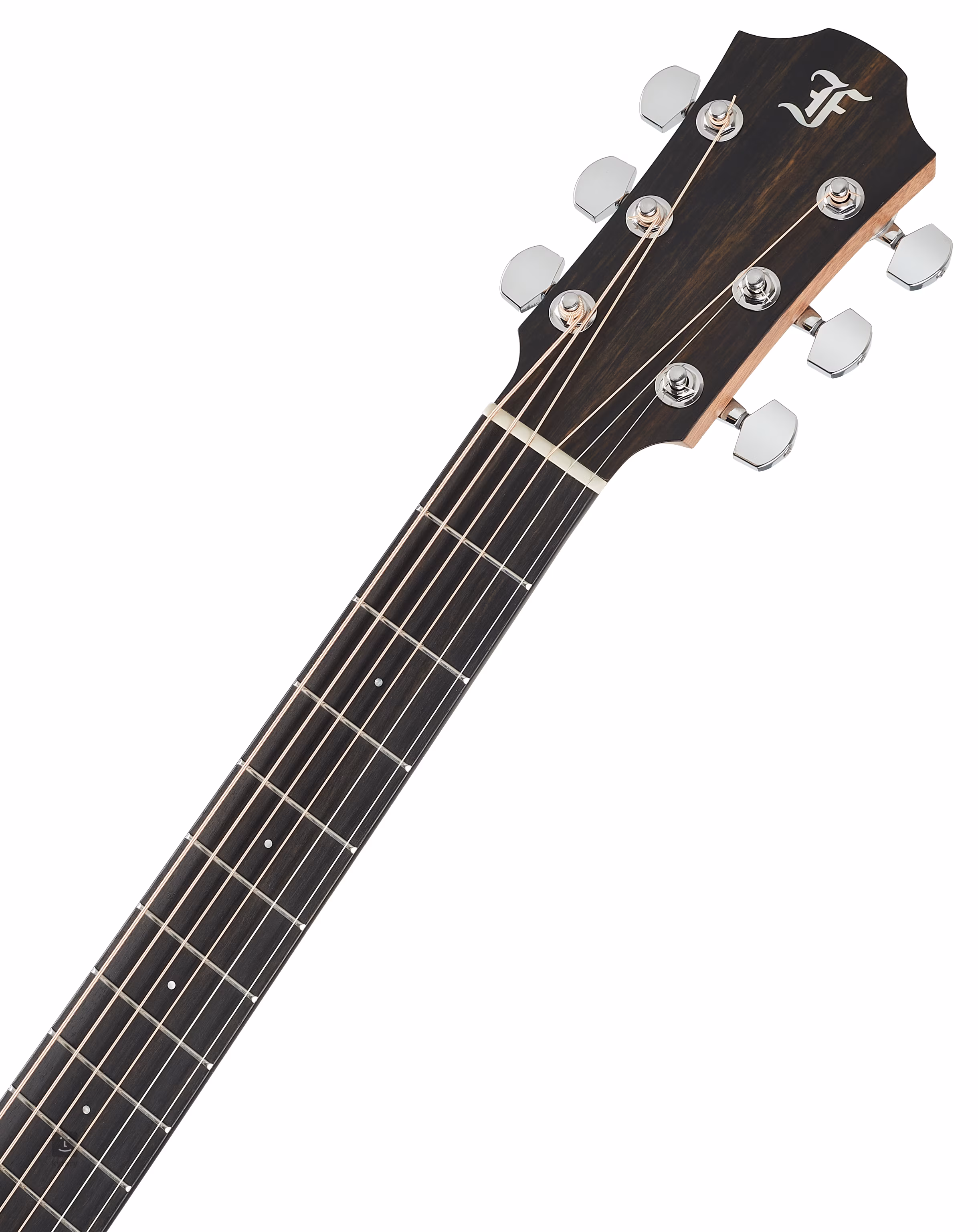 Orientaci na ebenovém hmatníku usnadňují boční a čelní bodové poziční značky z bílé perleti. Saténová úprava krku Full-Pore Smooth-Slide Satin Finish optimalizuje hratelnost a umožňuje klouzat plynule z akordu do akordu. Chromované firemní mechaniky s převodovým poměrem 1:18 jsou zárukou přesného a stabilního ladění. Luxusní vzhled kytar Furch Green podtrhuje lemovka z imitace slonoviny s výložkou z pěti vrstev černobílých kontrastních linek a rozeta tvořená dvojitým prstencem s vykládáním z černého ořechu.