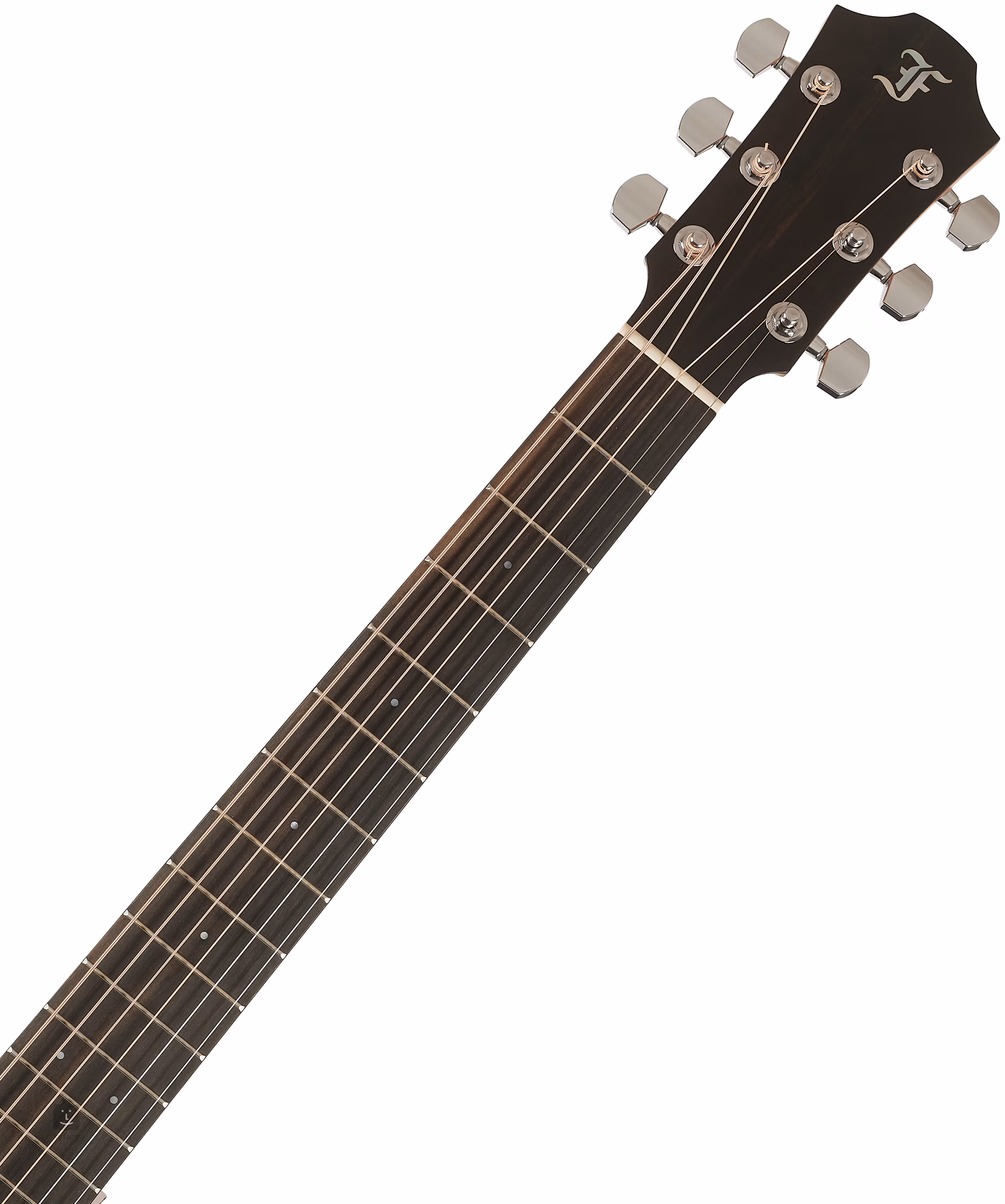 Orientáciu na ebenovom hmatníku uľahčujú biele perleťové bočné a predné polohové značky. Chrómované firemné mechaniky s prevodovým pomerom 1:18 zaručujú presné a stabilné ladenie. Luxusný vzhľad gitár Furch Green podčiarkuje lemovanie v imitácii slonoviny s piatimi vrstvami čiernych a bielych kontrastných línií a dvojkrúžková rozeta s intarziou z čierneho orecha.