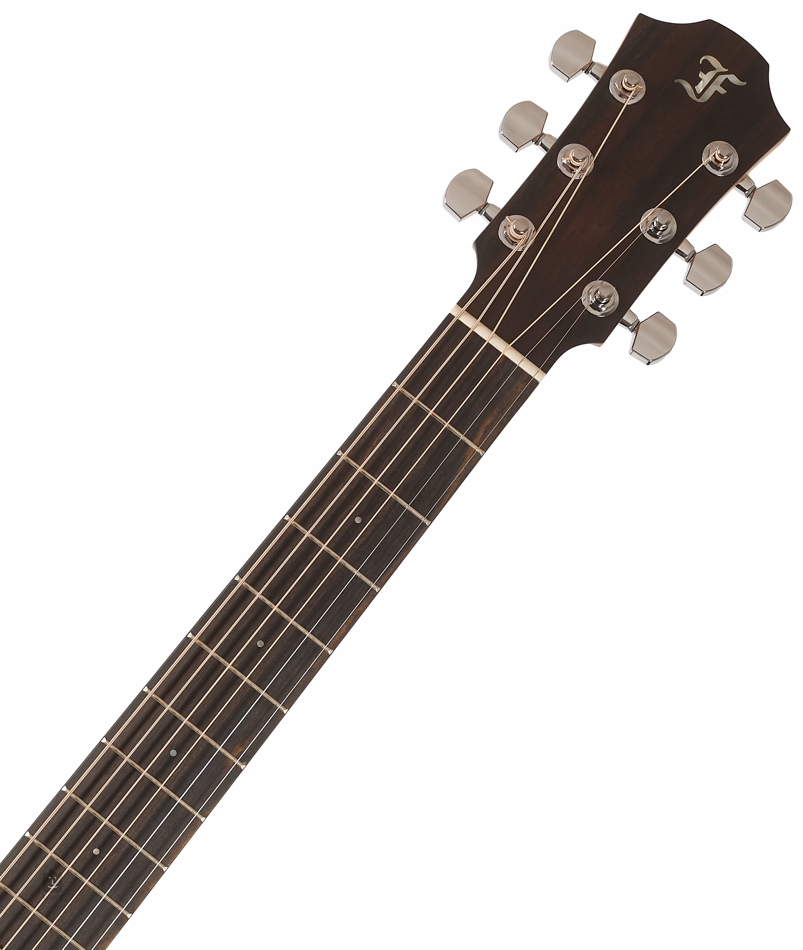 Orientáciu na ebenovom hmatníku uľahčujú predné a bočné perleťové bodové značky. Priehľadný pickguard necháva vyniknúť prirodzenú kresbu dreva, pričom neovplyvňuje rezonanciu rezonančnej dosky. Presné a stabilné ladenie zaručujú pochrómované firemné mechaniky s prevodovým pomerom 1:18. Nádherné spracovanie podčiarkuje imitácia korytnačieho panciera s piatimi vrstvami čiernych a bielych kontrastných línií a rozeta pozostávajúca z dvojitého prstenca s orechovou intarziou.