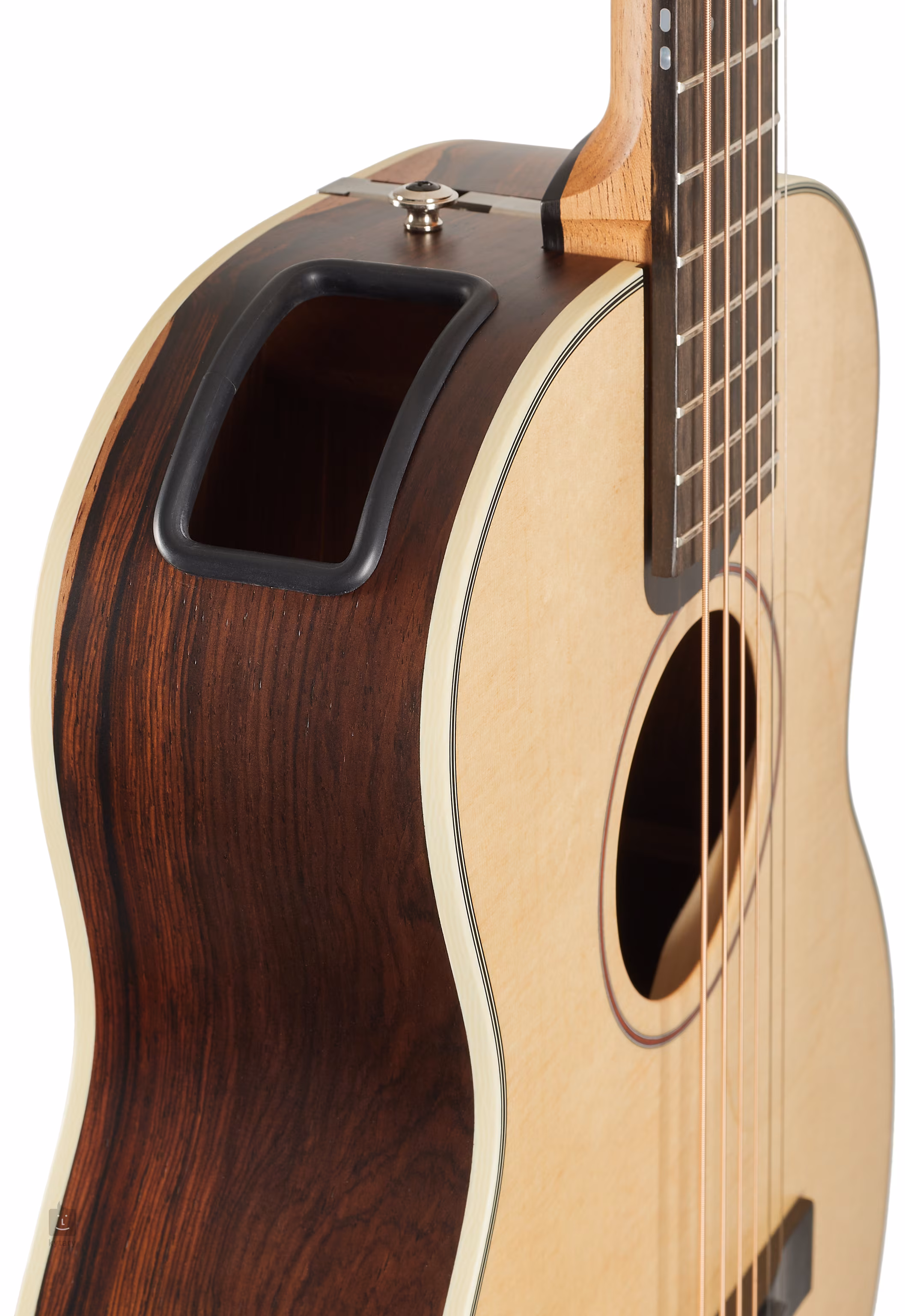 Predná doska cestovnej akustickej gitary Little Jane LJ 11-SC First Edition je vyrobená zo smreka Sitka kvality AAA, zatiaľ čo zadná doska a luby sú z exotického kokosového dreva kvality AA. Akustické vlastnosti nástroja vyzdvihujú najvyššiu úroveň individuálneho ladenia rezonančnej dosky, povrchová úprava s otvorenými pórmi podporuje prirodzené zvukové vlastnosti použitého dreva a poskytuje vynikajúcu úroveň povrchovej ochrany.