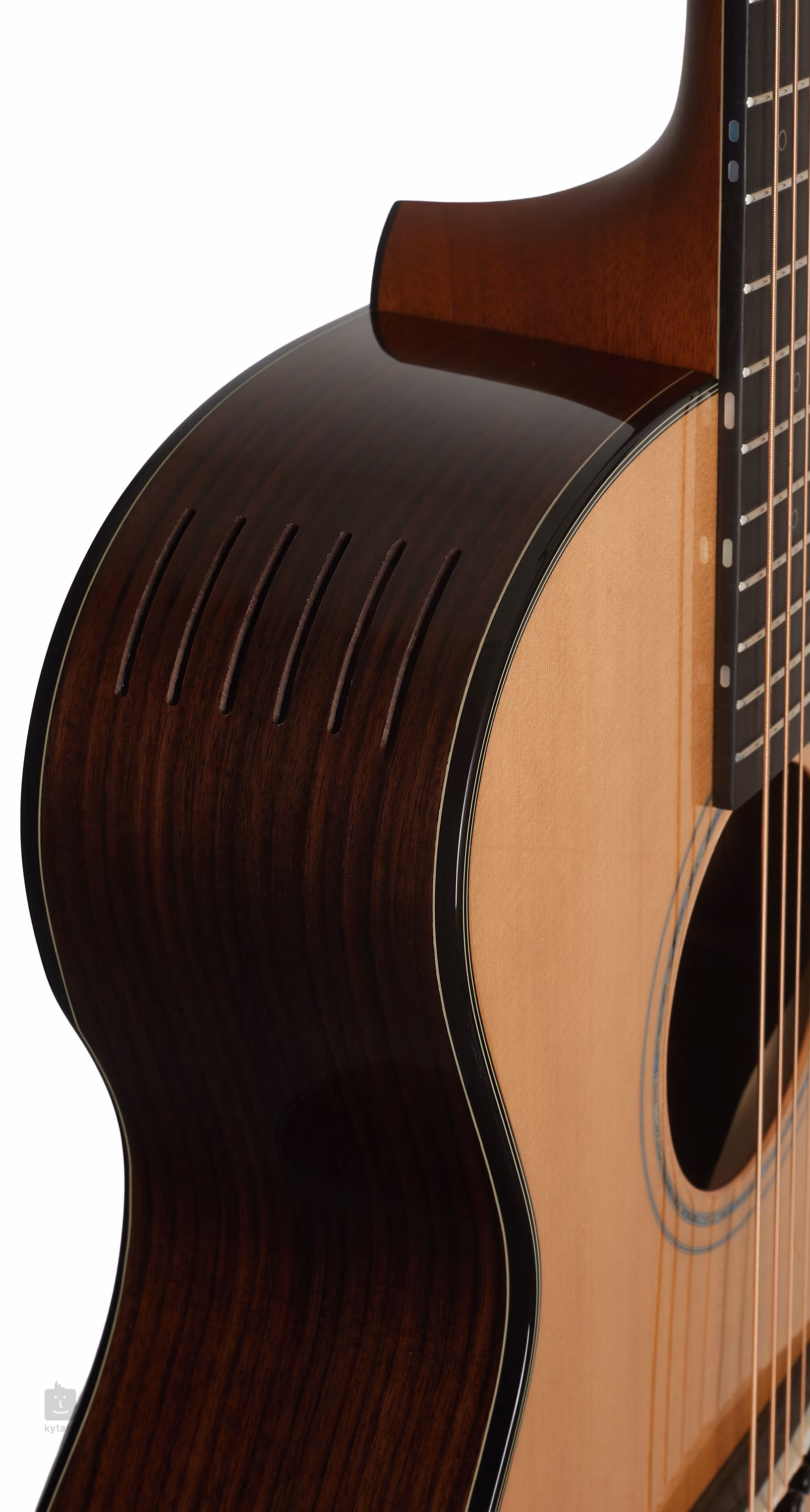 Orientaci na ebenovém hmatníku usnadňují elegantní polohové značky s tenkou obrysovou linkou z bílé perleti a boční perleťové bodové značky. Transparentní pickguard nechává vyniknout přirozené kresbě dřeva a zároveň neovlivňuje rezonanci přední desky. Stabilní ladění zaručují špičkové mechaniky Gotoh 510 ve stříbrné patině s leštěnými ebenovými kolíčky a vysoce jemným převodovým poměrem 1:21. Pěkné zpracování podtrhují jemné detaily v podobě dvojité prstencové rozety s vykládáním ze zeleného abalonu a černé lemovky s bílou kontrastní linkou.