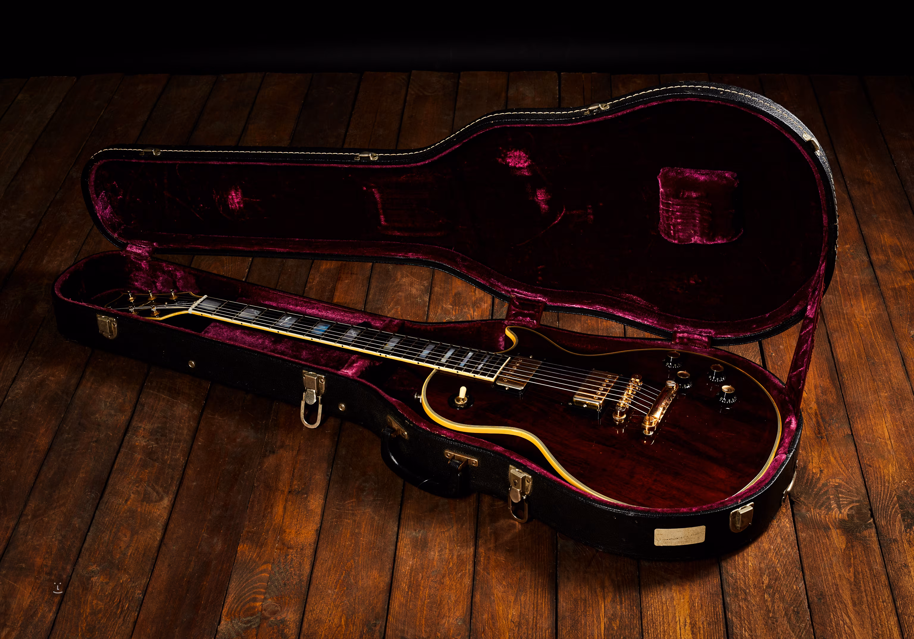Originálny Les Paul z roku 1976. Vintage gitara vo verzii Custom, tradične zdobená bohatým lemovaním a vybavená hardvérom v zlatej farbe, javorový krk je osadený ebenovým hmatníkom.