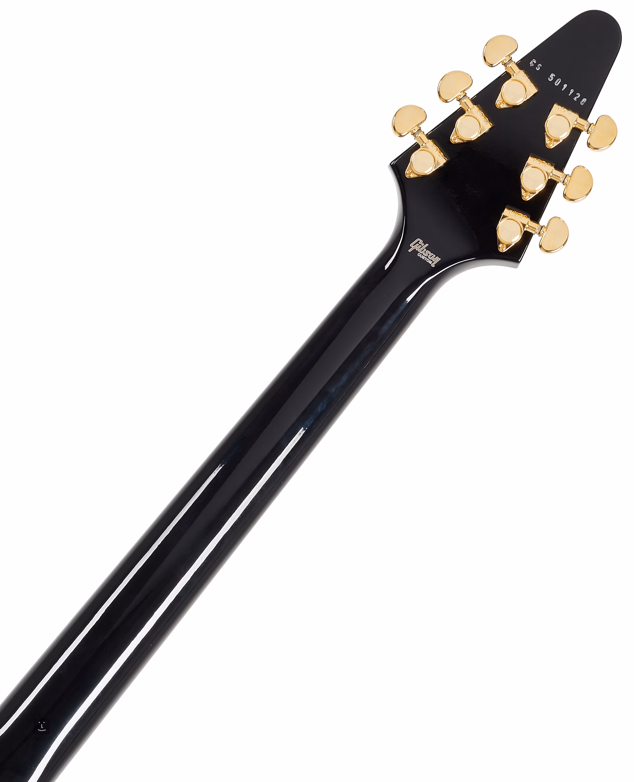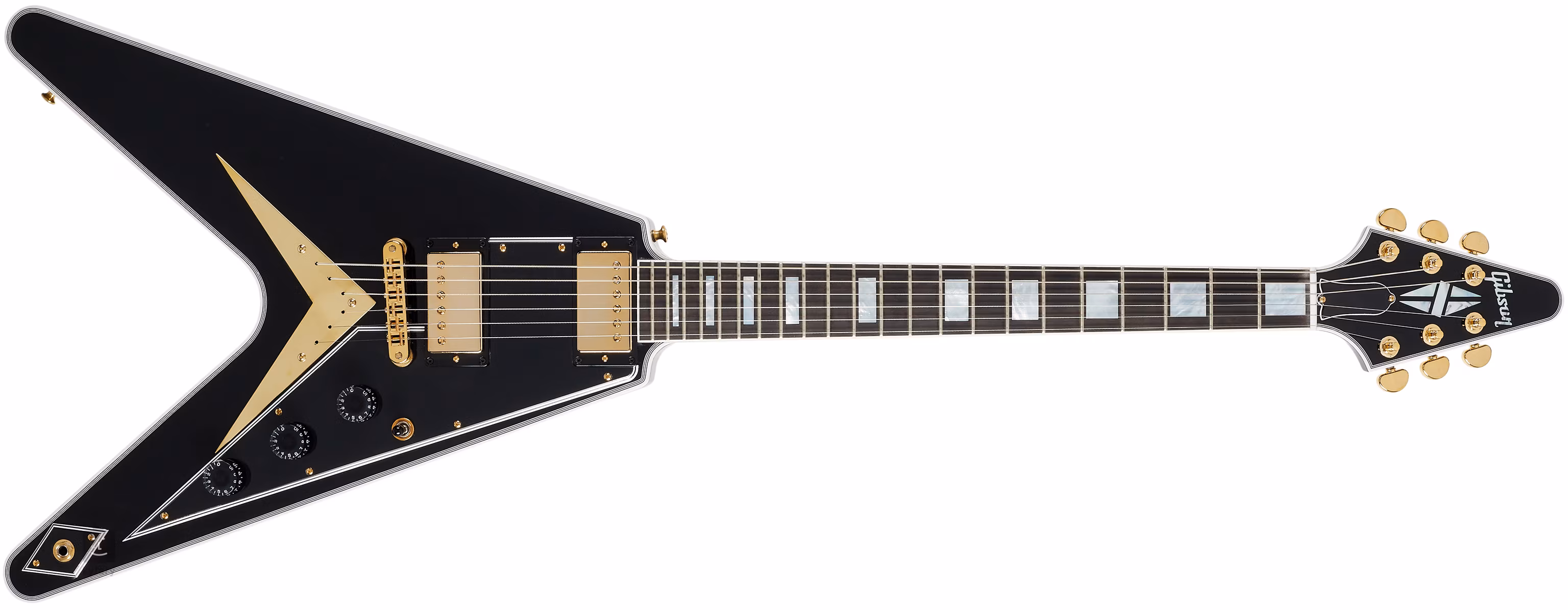 Tisíce rockových a metalových gitaristov na celom svete prisahajú na elektrickú gitaru Gibson Flying. Predstavuje jeden z najradikálnejších dizajnov v tvare gitary. Flying V Custom w/ Ebony Fingerboard Gloss Ebony je špičkový model z dielne Gibson Custom Shop.