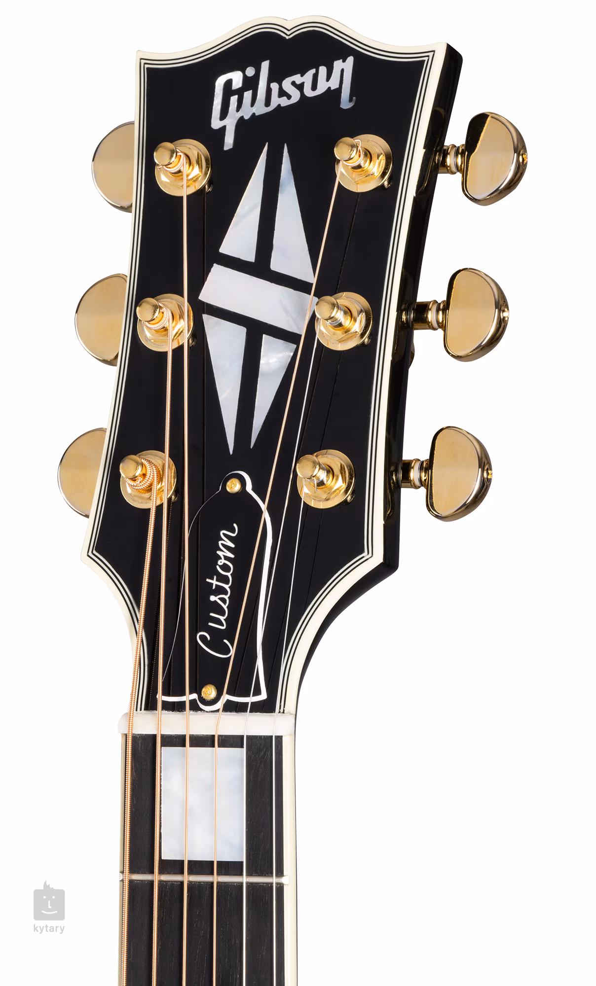 Špičková elektroakustická gitara J-45 Custom Ebony z dielne Gibson Custom Shop obsahuje tradičné prvky gitár Gibson J-45 Round Shoulder s detailmi prevzatými z modelov Les Paul Custom (tenký čierny nitrocelulózový lak, viacvrstvové obojstranné viazanie tela, Les Paul headstock s perleťovou Custom split diamond inlay).