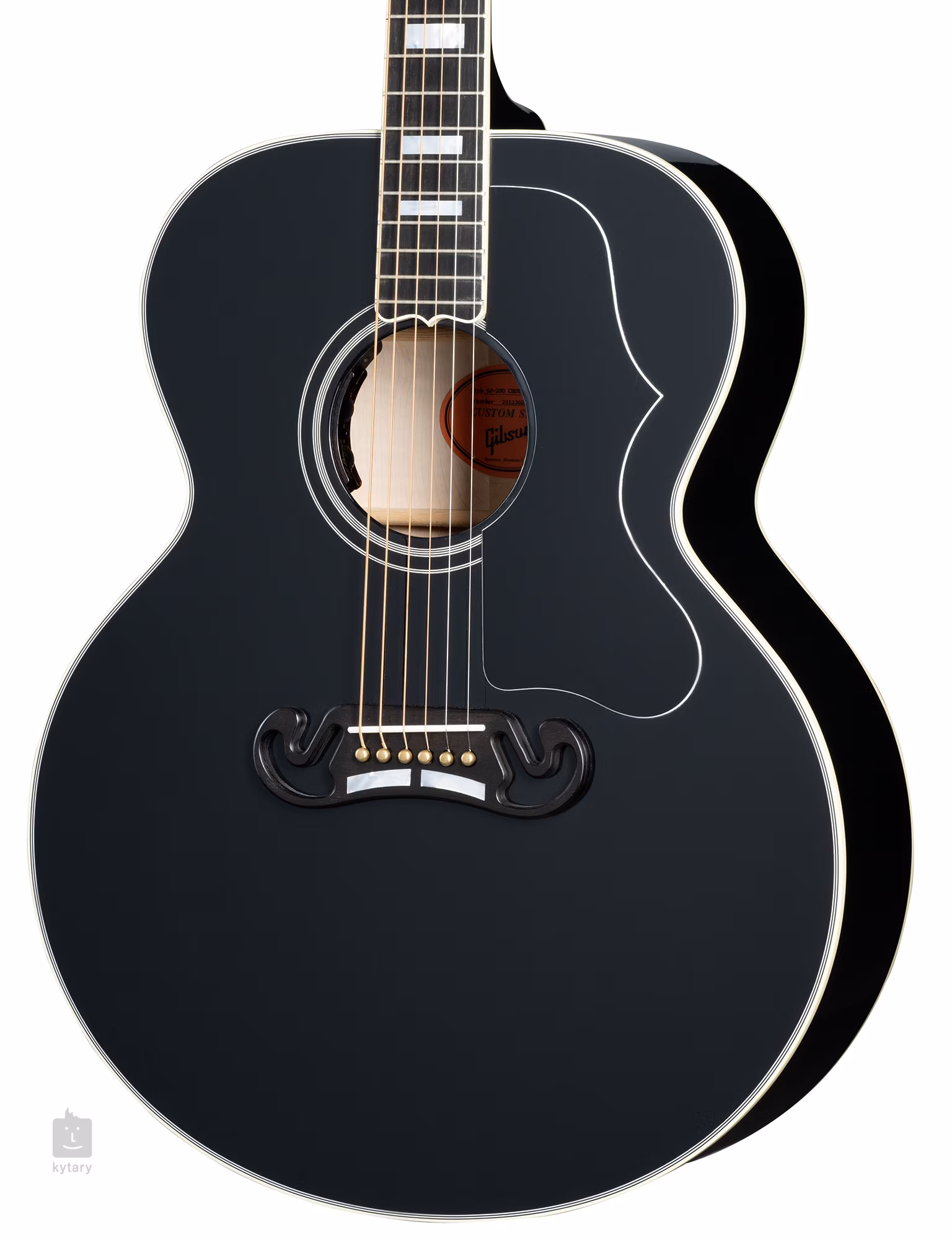 Špičková elektroakustická gitara SJ-200 Custom Ebony z dielne Gibson Custom Shop sa vyznačuje tradičnými prvkami Gibson SJ s detailmi prevzatými z modelov Les Paul Custom (tenký čierny nitrocelulózový lak, viacvrstvová obojstranná väzba tela, Les Paul headstock s perleťovou Custom split diamond intarziou).