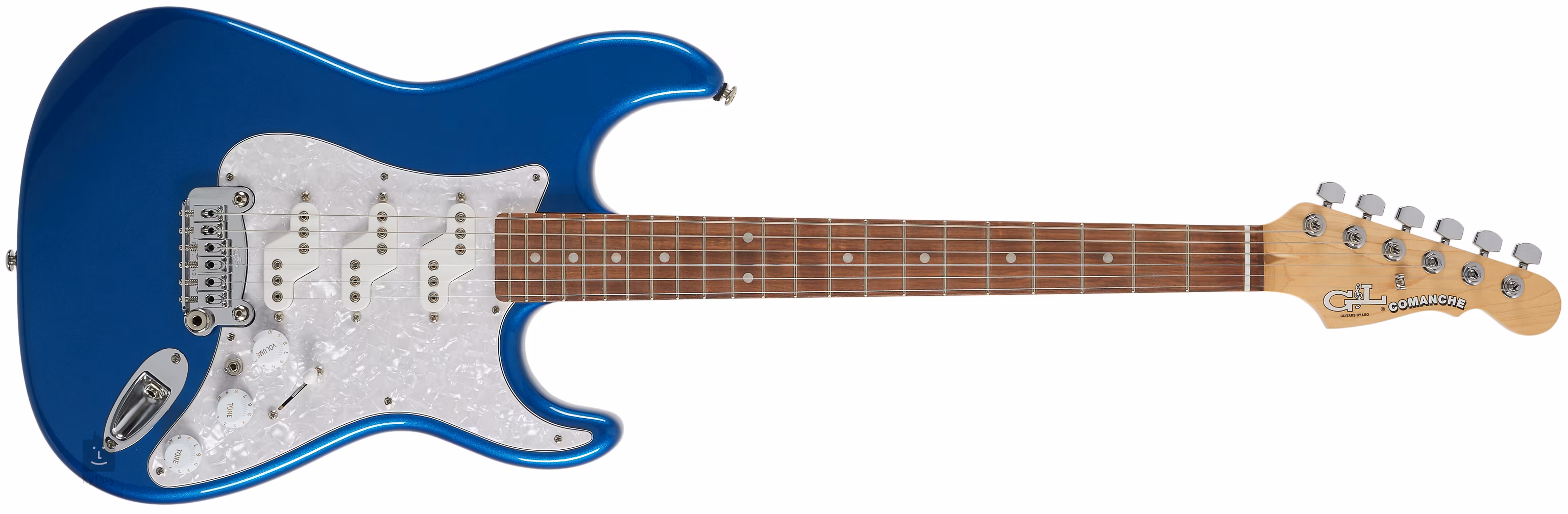 Dizajn elektrickej gitary G&L Comanche predstavuje posledné slovo Lea Fendera v oblasti klasického dizajnu ST s dvojitým výrezom. Telo USA Fullerton Deluxe Comanche Midnight Blue Metallic je vyrobené z jelše. Palisandrový hmatník s dvadsiatimi dvoma Medium Jumbo pražcami (Jescar 57110) je prilepený na skrutkovaný javorový krk s profilom "Modern Classic". Polohové bodky na hmatníku uľahčujú orientáciu.