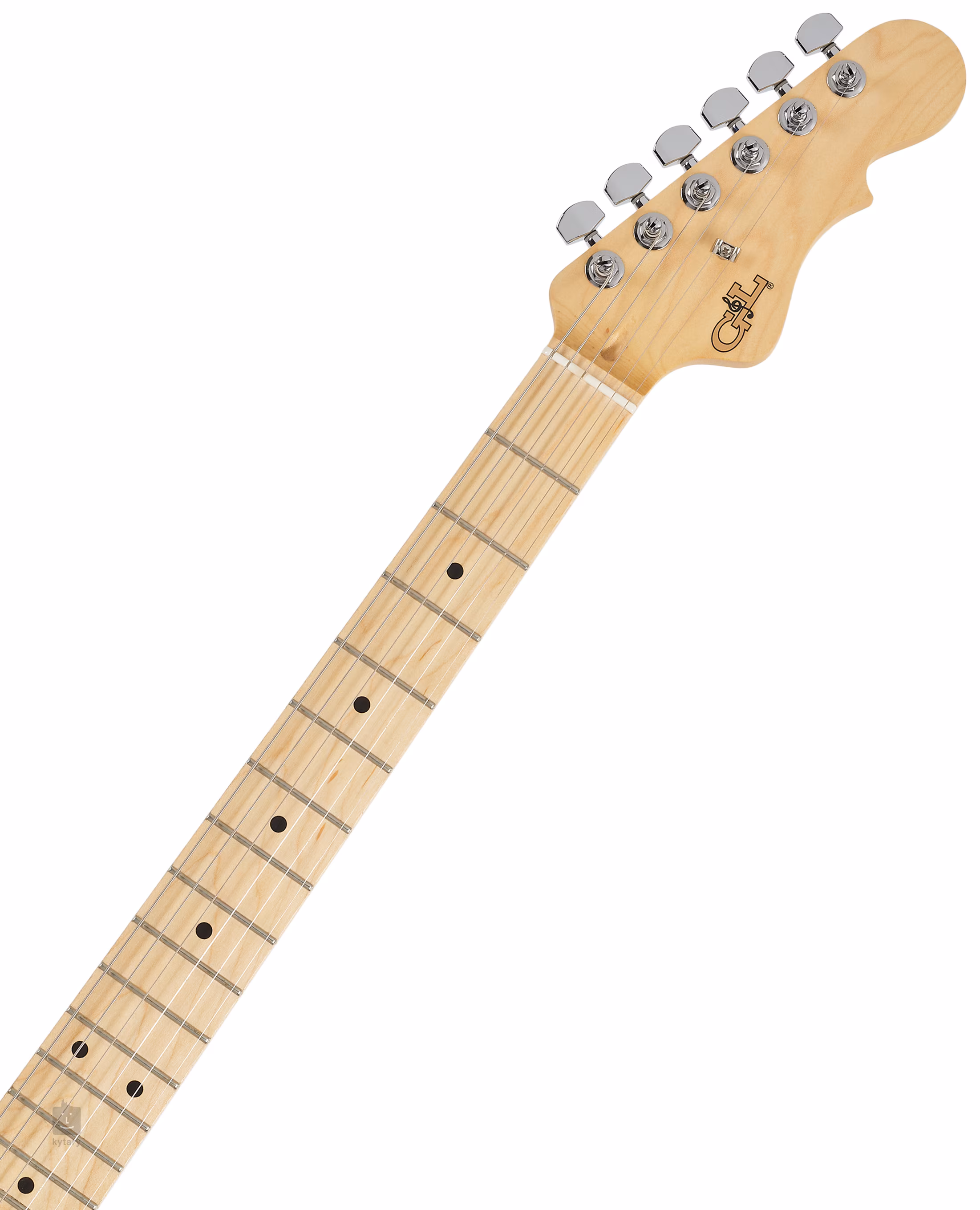 Elektrické gitary G&L Doheny ponúkajú kombináciu ofsetového dizajnu tela a špeciálne navrhnutých jazzových snímačov typu single-coil Magnetic Field Design. Model USA Fullerton Deluxe Doheny Red Ruby Metallic má telo z jelše, skrutkovaný javorový krk s profilom "Modern Classic" a javorový hmatník osadený dvadsaťjeden Medium Jumbo niklovými pražcami. Polohové bodky na hmatníku uľahčujú orientáciu.