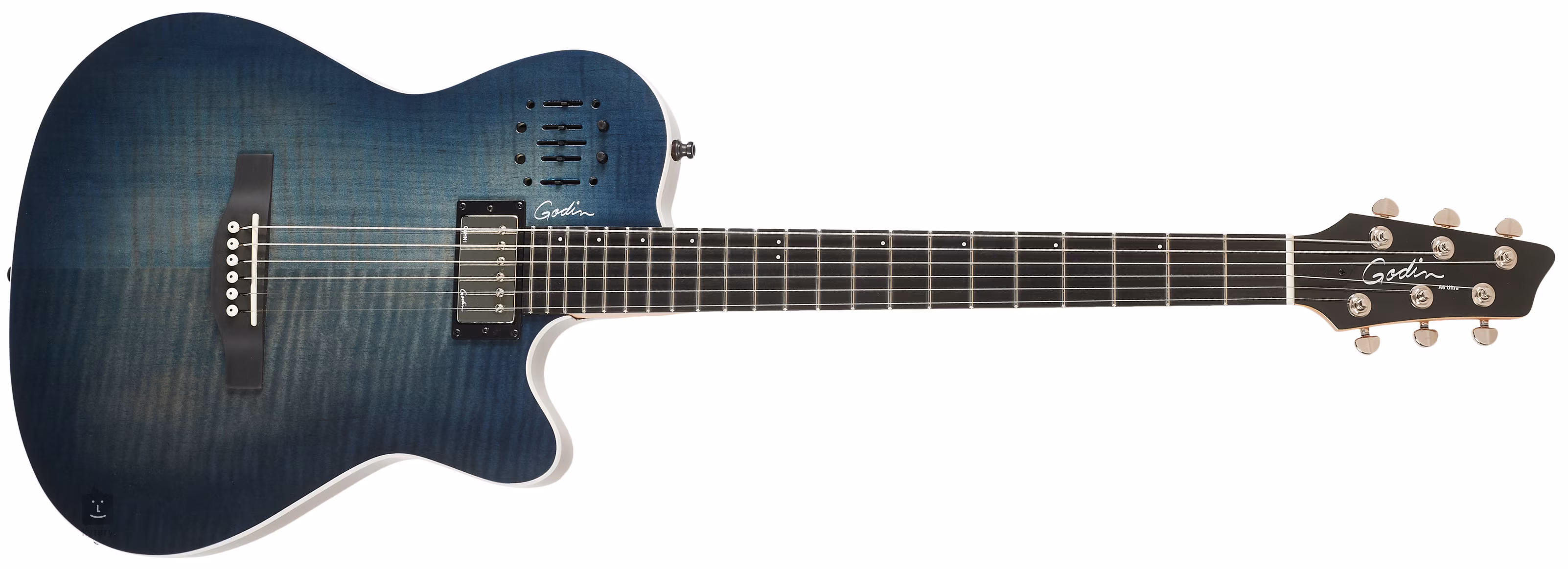 Kombinácia snímania zvuku piezo snímačom pod krkom a humbuckerom Godin Custom pri krku ponúka širokú škálu tónov zo sveta akustických a elektrických gitár, ktoré môžete ľubovoľne kombinovať. Charakter zvuku upravíte pomocou ovládačov hlasitosti snímačov a trojpásmového (piezo) a dvojpásmového (humbucker) ekvalizéra. Dva gitarové výstupy umožňujú posielať čistý signál z humbuckera alebo mix oboch snímačov.