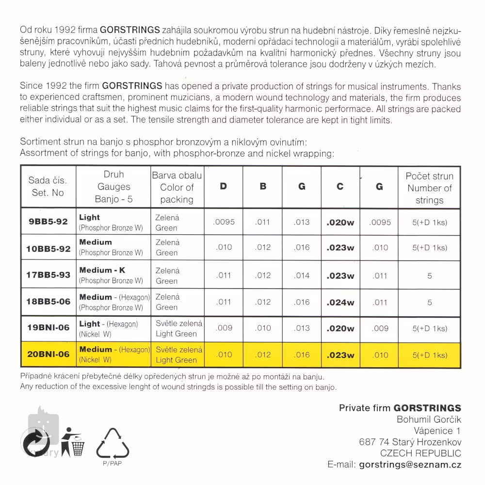 Struny pre päťstrunové banjo od českého výrobcu Gorstrings ponúkajú veľmi čistý a špecifický tón, dlhú životnosť a spoľahlivú stabilitu ladenia. Ich šesťhranné oceľové jadro je vinuté poniklovanou oceľou, vďaka čomu majú jasný a zvonivý tón, ideálny pre charakteristický zvuk banja. Ak hľadáte struny na vystúpenie pri táboráku alebo na country, táto súprava môže byť pre vás tou správnou voľbou. Struny sú vyrobené z prvotriednych materiálov a prešli rukami najlepších českých remeselníkov. Doprajte svojmu nástroju to najlepšie so sadou od Gorstrings!
