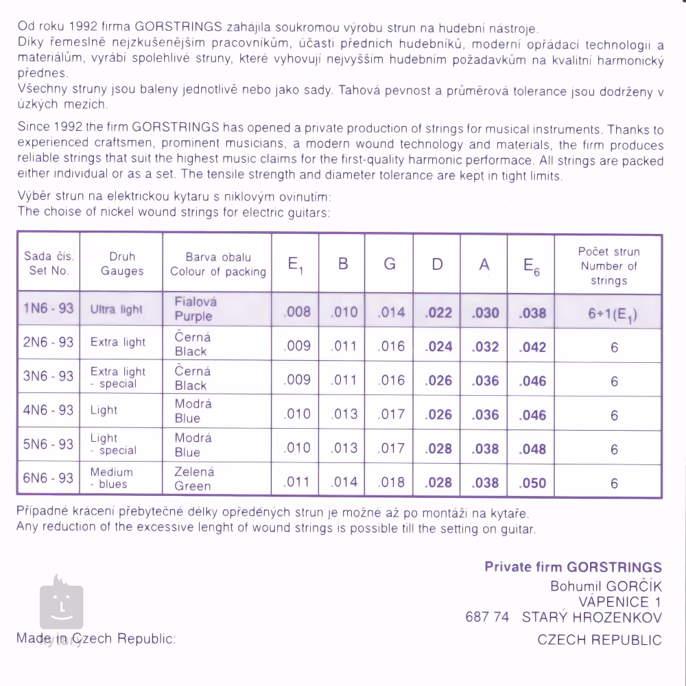 Struny pre elektrické gitary od českého výrobcu Gorstrings ponúkajú čistý, frekvenčne vyvážený tón, ktorý vynikne skutočný potenciál vašej gitary. Sú založené na okrúhlom oceľovom jadre ovinutom niklovaným oceľovým drôtom, čo im dodáva teplejší, zaoblenejší charakter. Struny sú vyrobené z prvotriednych materiálov a boli vyrobené tými najlepšími českými remeselníkmi. Doprajte svojej gitare to najlepšie s Gorstrings!