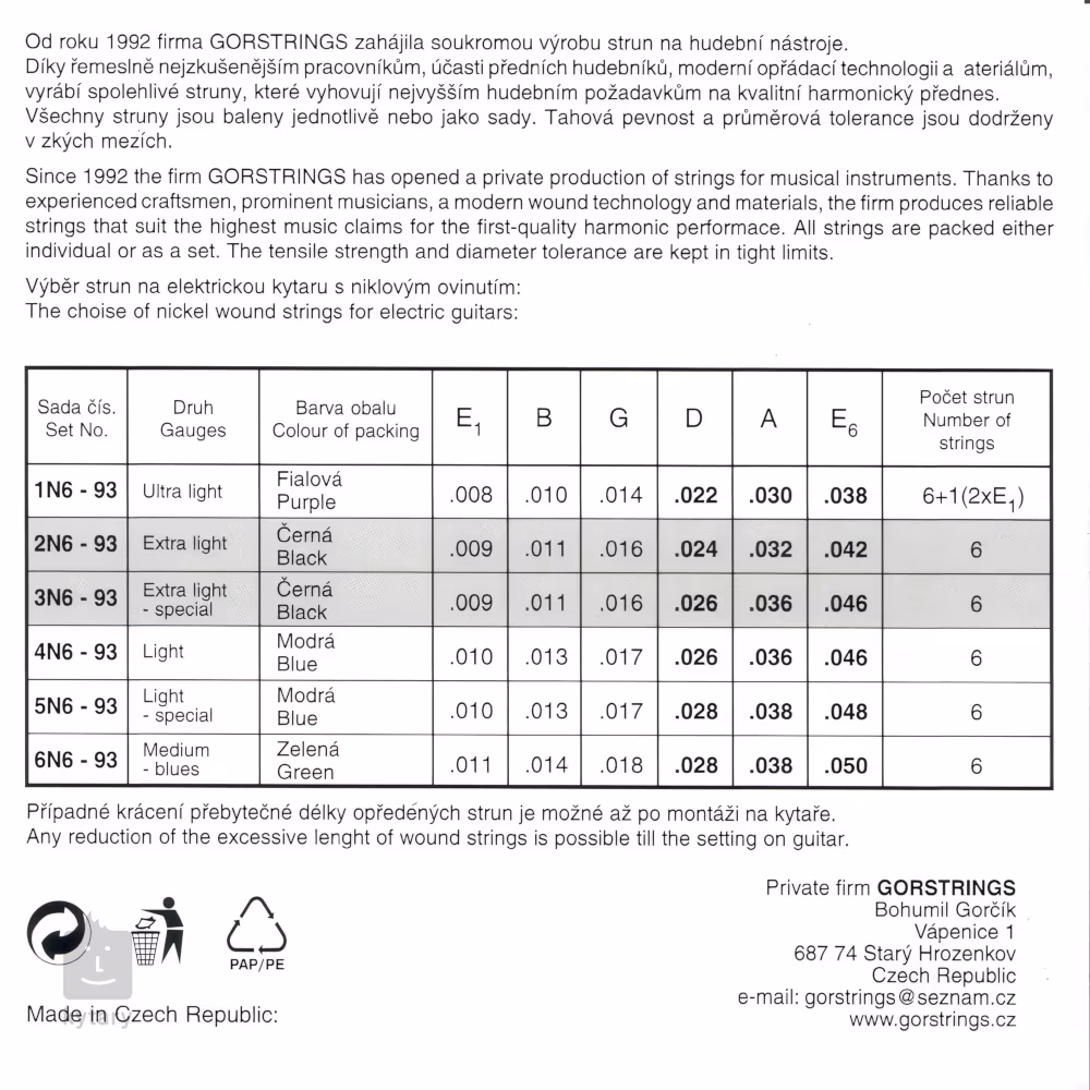 Struny pre elektrické gitary od českého výrobcu Gorstrings ponúkajú čistý, frekvenčne vyvážený tón, ktorý odhalí skutočný potenciál vašej gitary. Ich základom je okrúhle oceľové jadro, ktoré je vinuté poniklovanou oceľou - vďaka tomu majú teplý, zaoblený charakter. Struny sú vyrobené z prvotriednych materiálov a prešli rukami najlepších českých remeselníkov. Doprajte svojej gitare to najlepšie so strunami Gorstrings!
