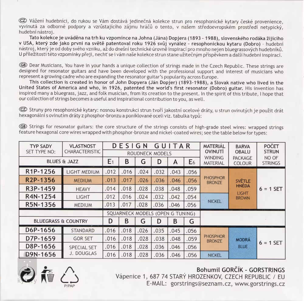 Resofonické struny od českého výrobcu Gorstrings sú určené pre rezofonickú gitaru, známu tiež ako rezonátor alebo dobro. Kolekcia bola uvedená na trh na počesť Johna (Jana) Dopjera, slovenského rodáka žijúceho v USA, ktorý si ako prvý na svete dal patentovať svoj vynález - rezofonickú gitaru. Tento netradičný nástroj od svojho vynálezu inšpiroval mnohých hudobníkov, najmä v žánroch ako bluegrass a blues. Struny sú vyrobené zo šesťhranného oceľového jadra, ktoré je obalené obľúbenou zliatinou fosforu a bronzu - to zjemňuje a zaokrúhľuje charakteristicky prenikavý tón dobra, čím mu dodáva príjemný tón na teplejšej strane spektra. Doprajte svojej gitare to najlepšie so strunami Gorstrings!